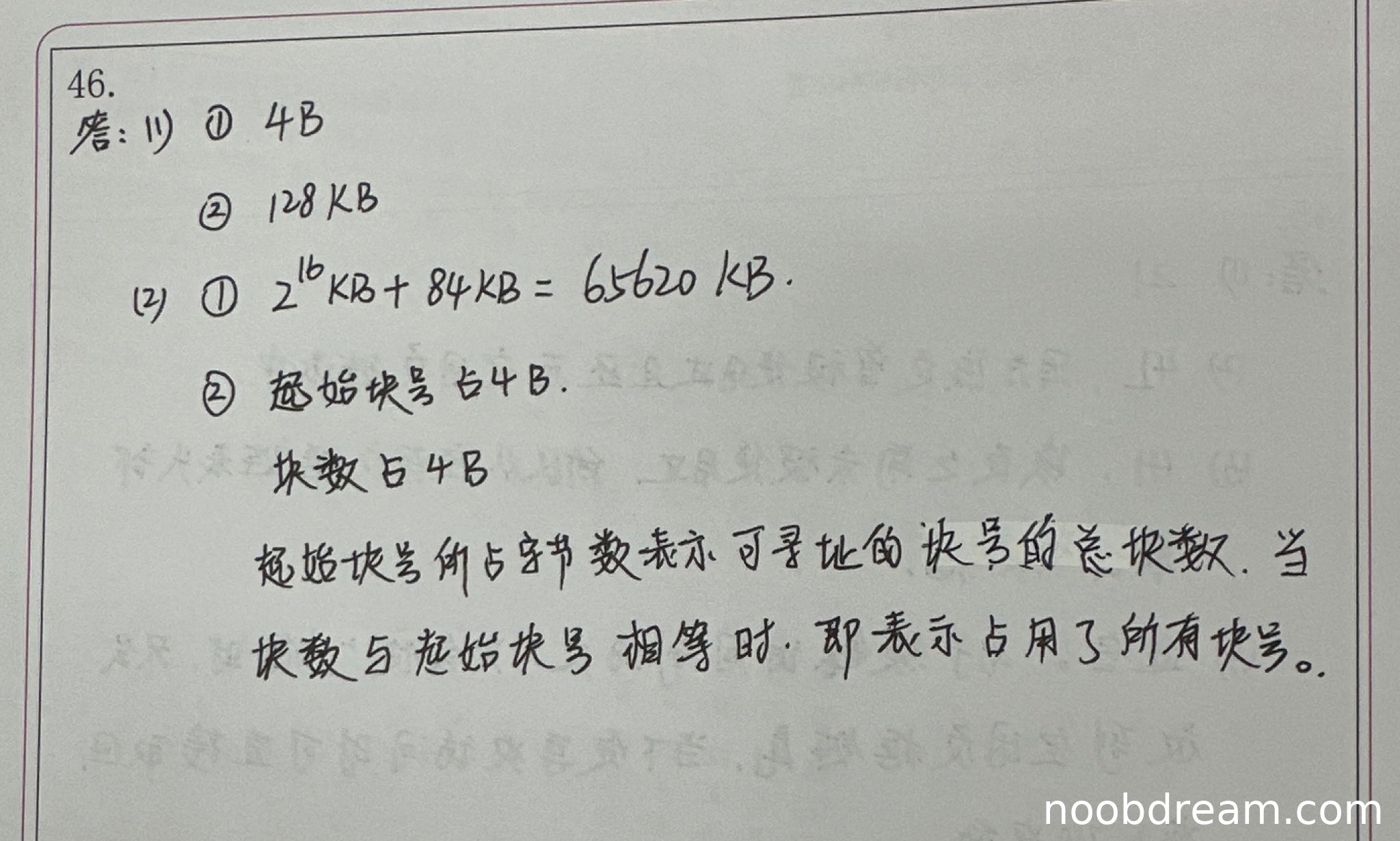 学生答案:① 2¹⁶KB + 84KB = 65620KB ② 起始块号占4B,块数占4B