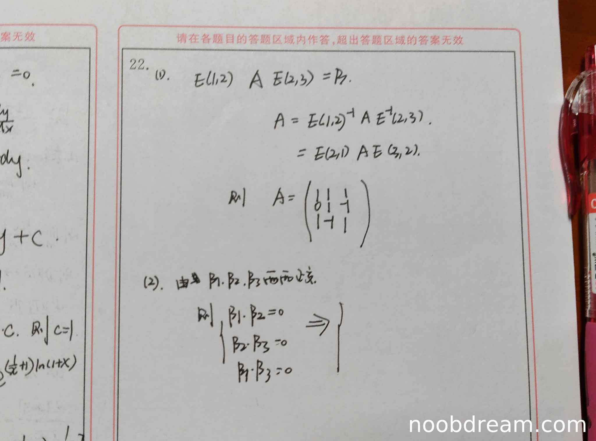 学生正确使用了初等矩阵表示行交换和列交换操作,思路正确。但在计算过程中出现了错误:最终得到的矩阵A与标准答案不一致。标准答案为 \(\begin{pmatrix} 1 & 1 & 1 \\ 0 & 1 & -1 \\ 1 & -1 & 1 \end{pmatrix}\),而学生得到的是 \(\begin{pmatrix} 0 & 1 & 1 \\ 1 & 1 & 1 \\ 1 & -1 & 1 \end{pmatrix}\)。考虑到计算错误但思路正确,扣2分。