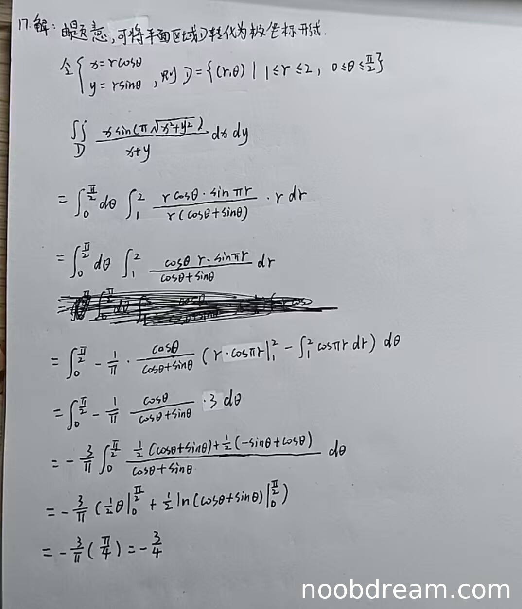 - 从第三步到第四步,学生直接写出了 \(-\frac{1}{\pi}\cdot\frac{\cos\theta}{\cos\theta+\sin\theta}(r\cdot\cos(\pi r)|_{1}^{2}-\int_{1}^{2}\cos(\pi r)dr)\) 的结果为 \(-\frac{1}{\pi}\cdot\frac{\cos\theta}{\cos\theta+\sin\theta}\cdot3\),这一步计算有误。正确计算应该是先对r积分得到具体数值,而不是保留θ的函数形式。