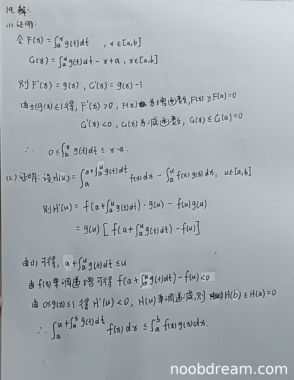 学生证明(I)时,采用了构造辅助函数的方法:令 \(F(x)=\int_a^x g(t)dt\) 和 \(G(x)=\int_a^x g(t)dt - (x-a)\),通过导数符号判断单调性,得出 \(0 \leq \int_a^x g(t)dt \leq x-a\)。此方法与标准答案(积分中值定理)不同,但思路正确且逻辑严密,结论正确。因此不扣分,得5分。