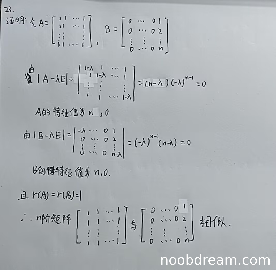 学生正确计算了矩阵A和B的特征多项式,得到特征值均为n(单根)和0(n-1重根),这部分正确。但学生仅通过特征值相同和秩相同(r(A)=r(B)=1)就得出相似结论,这是不充分的。两个矩阵相似需要满足:特征值相同且每个特征值的几何重数等于代数重数(即可对角化)。学生没有证明矩阵B可以对角化(即没有验证特征值0对应的特征向量有n-1个线性无关),这是关键缺失。标准答案中明确证明了A是实对称矩阵必可对角化,B通过计算零特征值对应的特征子空间维数证明了可对角化。因此学生答案存在逻辑缺陷,扣分。