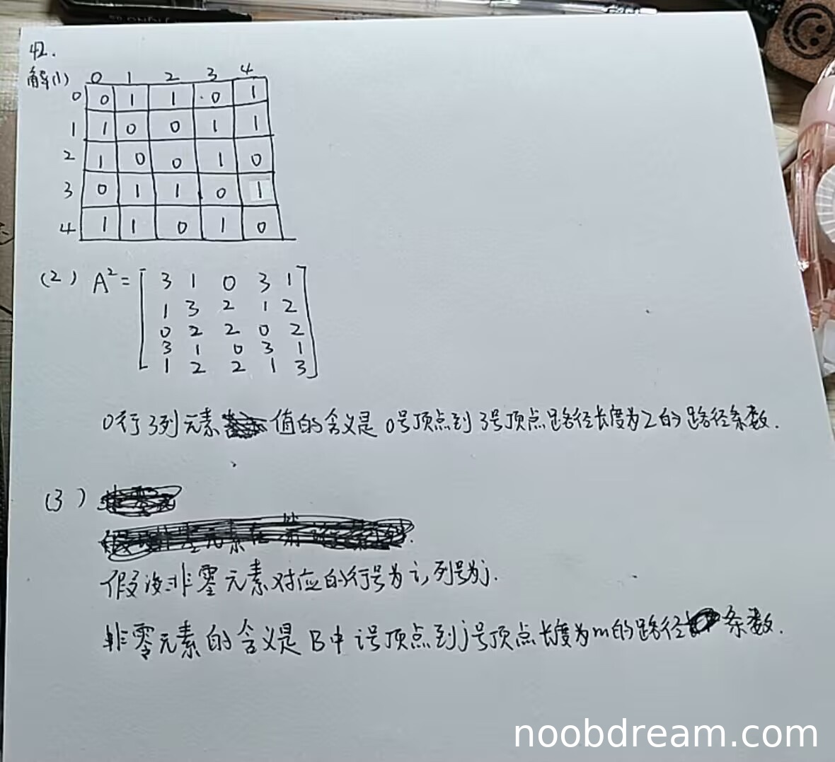 学生正确计算出了 \(A^2\) 矩阵,且矩阵元素与标准答案完全一致。对于0行3列元素值的含义解释正确,准确描述了"从顶点0到顶点3路径长度为2的路径条数"。因此本题得满分4分。