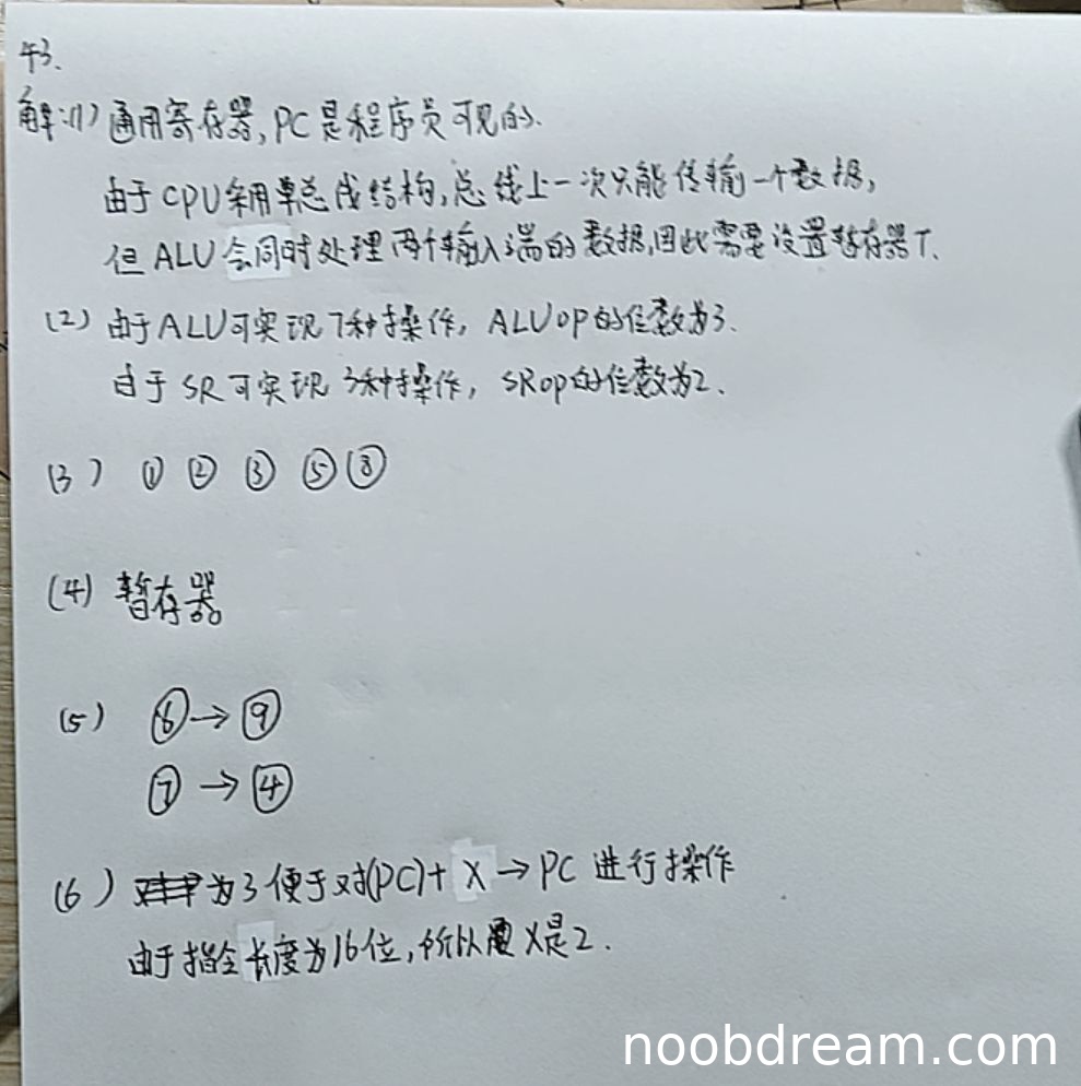 学生答出了通用寄存器和PC是程序员可见的,得2分;解释了暂存器T的作用是因为单总线结构需要暂存数据,得1分。答案完整正确,得满分3分。