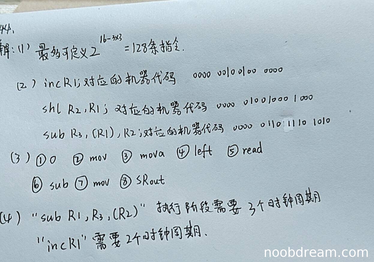 分析:学生正确计算出指令系统最多可定义128条指令,虽然计算过程表述略有不同(16-3×3=7,2^7=128),但结果正确且逻辑无误。
