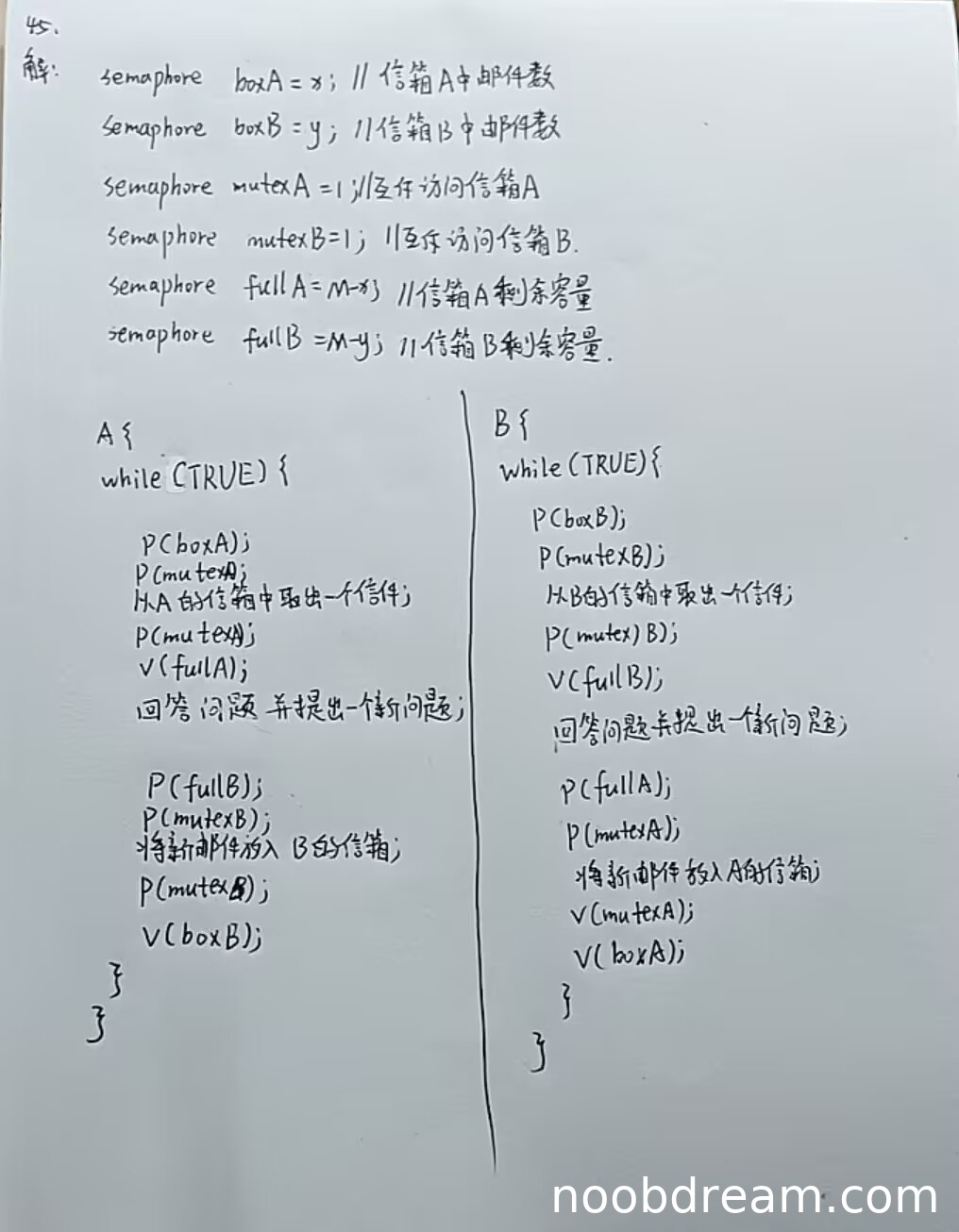 - 第二个P(mutexB)应该是V(mutexB),这是严重逻辑错误(扣1分)