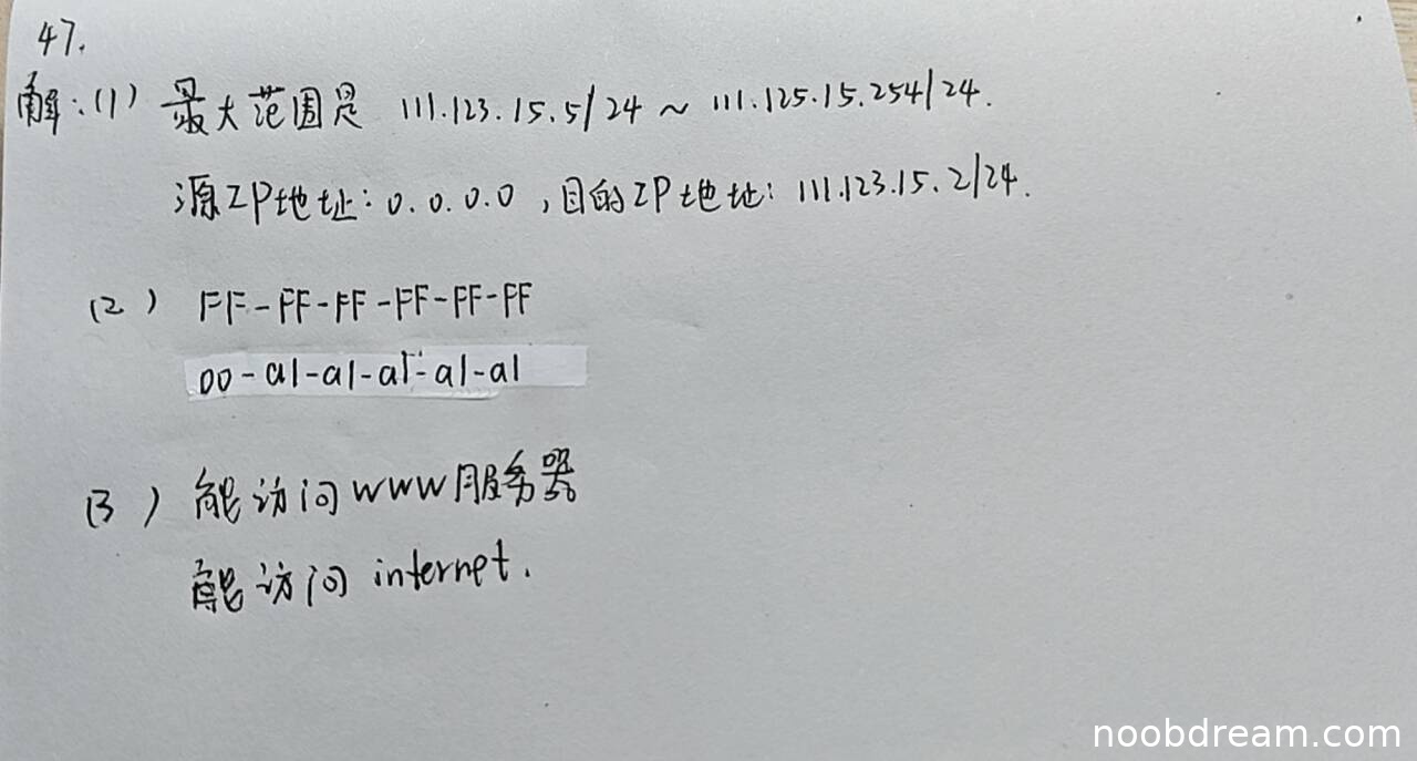 学生答案中,DHCP动态分配IP地址的最大范围写为"111.123.15.5/24~111.123.15.254/24",与标准答案"111.123.15.5~111.123.15.254"基本一致,只是多了"/24"表示子网掩码,但核心范围正确,得1分。DHCP Discover报文的源IP地址"0.0.0.0"正确,得0.5分;但目的IP地址写为"111.123.15.2/24"错误,应为"255.255.255.255",扣1分。本小题得1.5分。