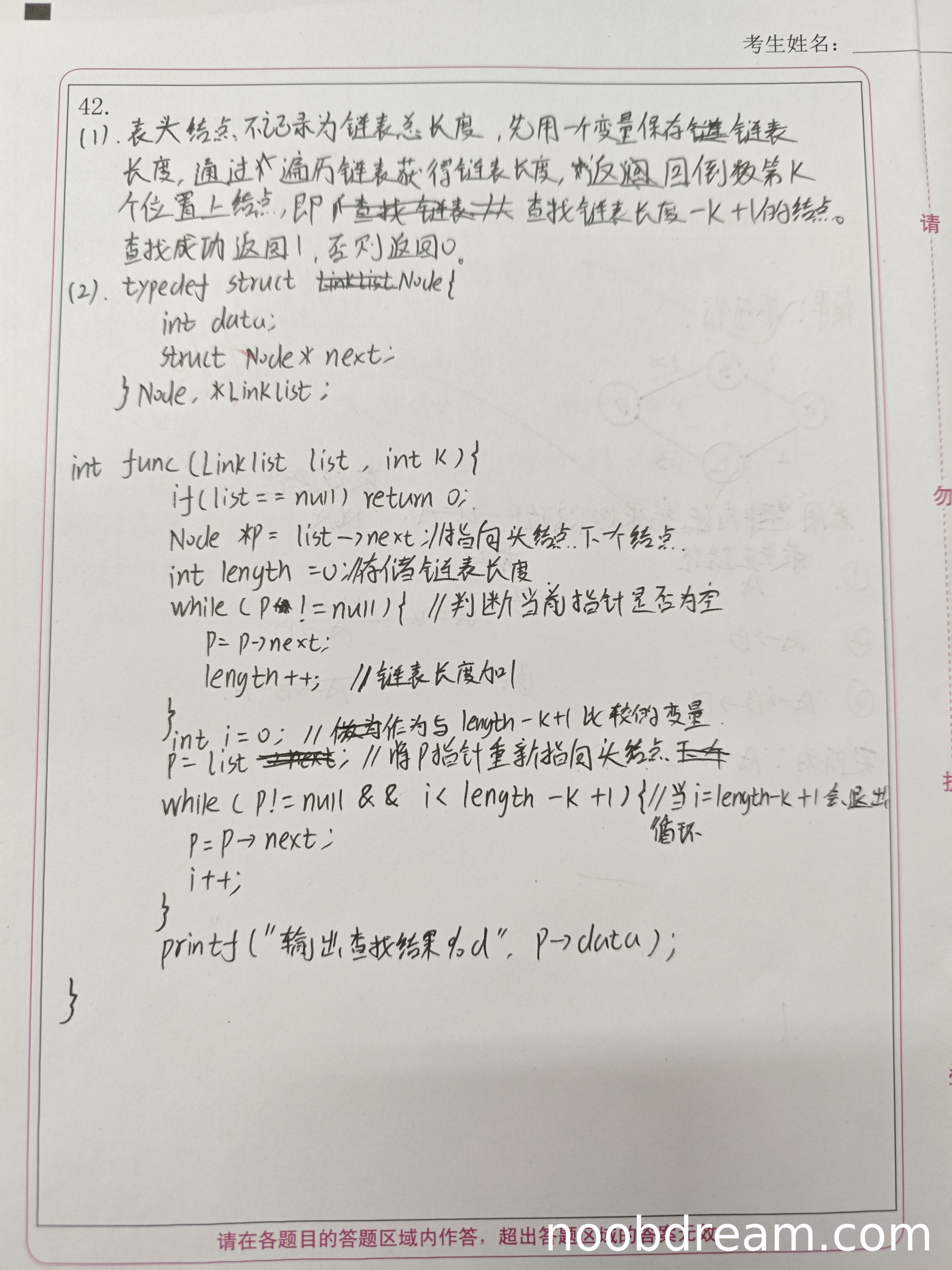 理由:学生给出了详细的实现步骤,包括计算链表长度和定位目标结点两个主要步骤,逻辑完整。但由于需要两遍扫描,效率不如标准答案的一遍扫描方法,扣2分。