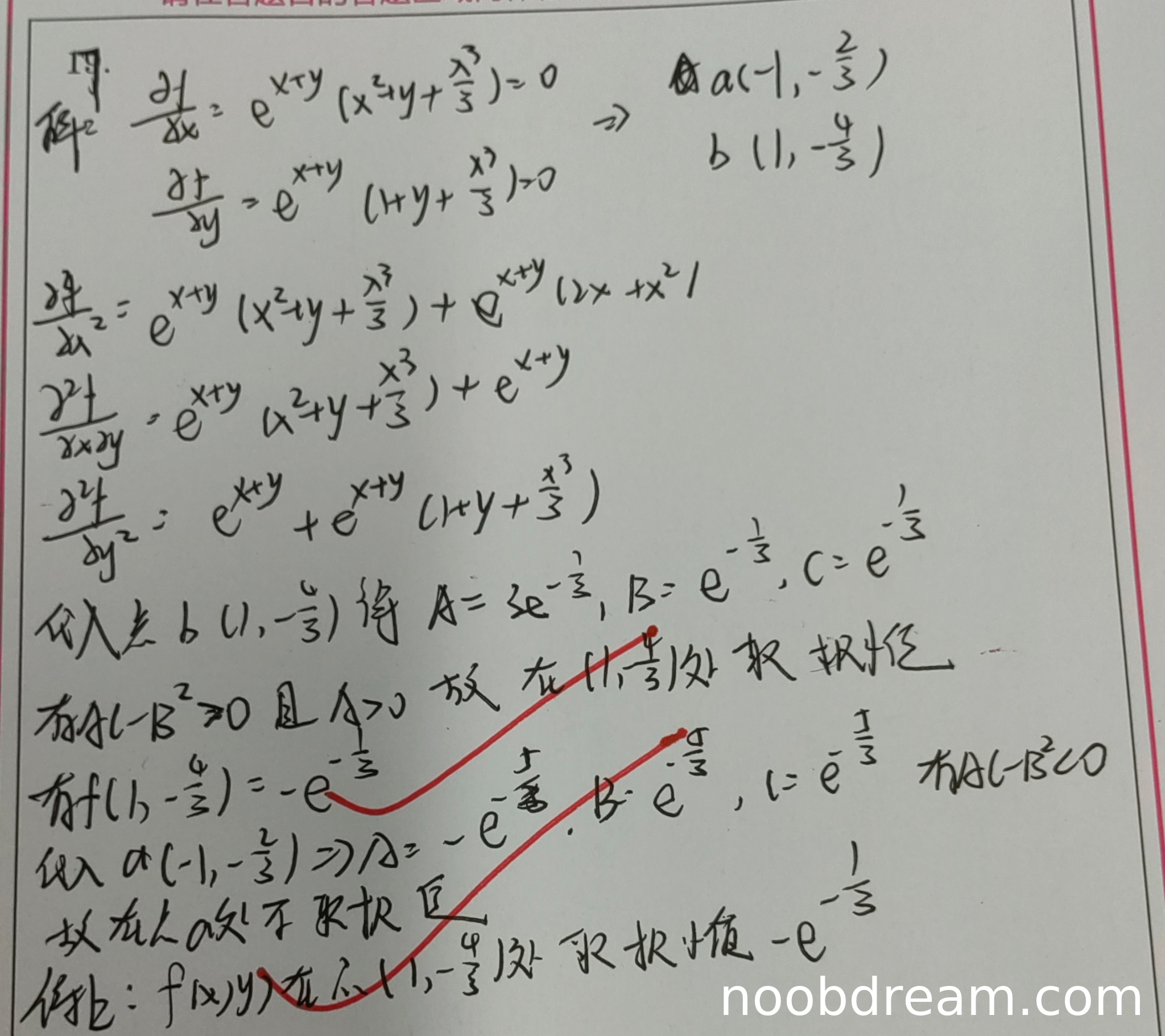 学生给出的函数表达式与题目不一致:题目是 \(f(x, y)=\left(y+\frac{x^{3}}{3}\right) e^{x+y}\),而学生识别为 \(f(x,y)=e^{x + y}(x^{2}y+\frac{x^{3}}{3})\),这是根本性错误。虽然后续求导过程有部分正确形式,但基于错误函数表达式,导致整个求解方向偏离。扣3分。