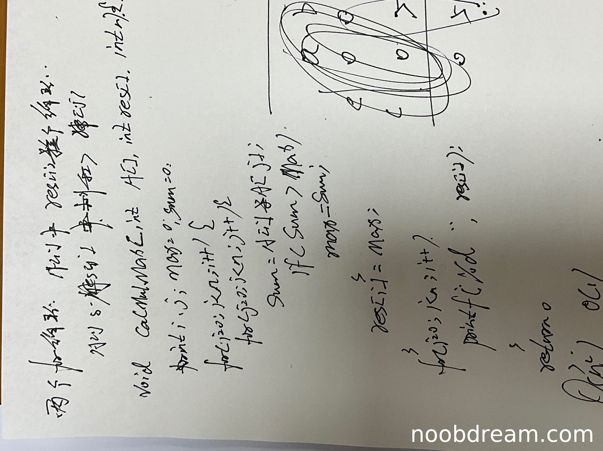 得0分。学生作答中完全没有给出算法的基本思想,而是提供了一段不完整的代码片段,且该代码与题目要求的CalMulMax函数无关。无法看出学生对题目要求的理解。