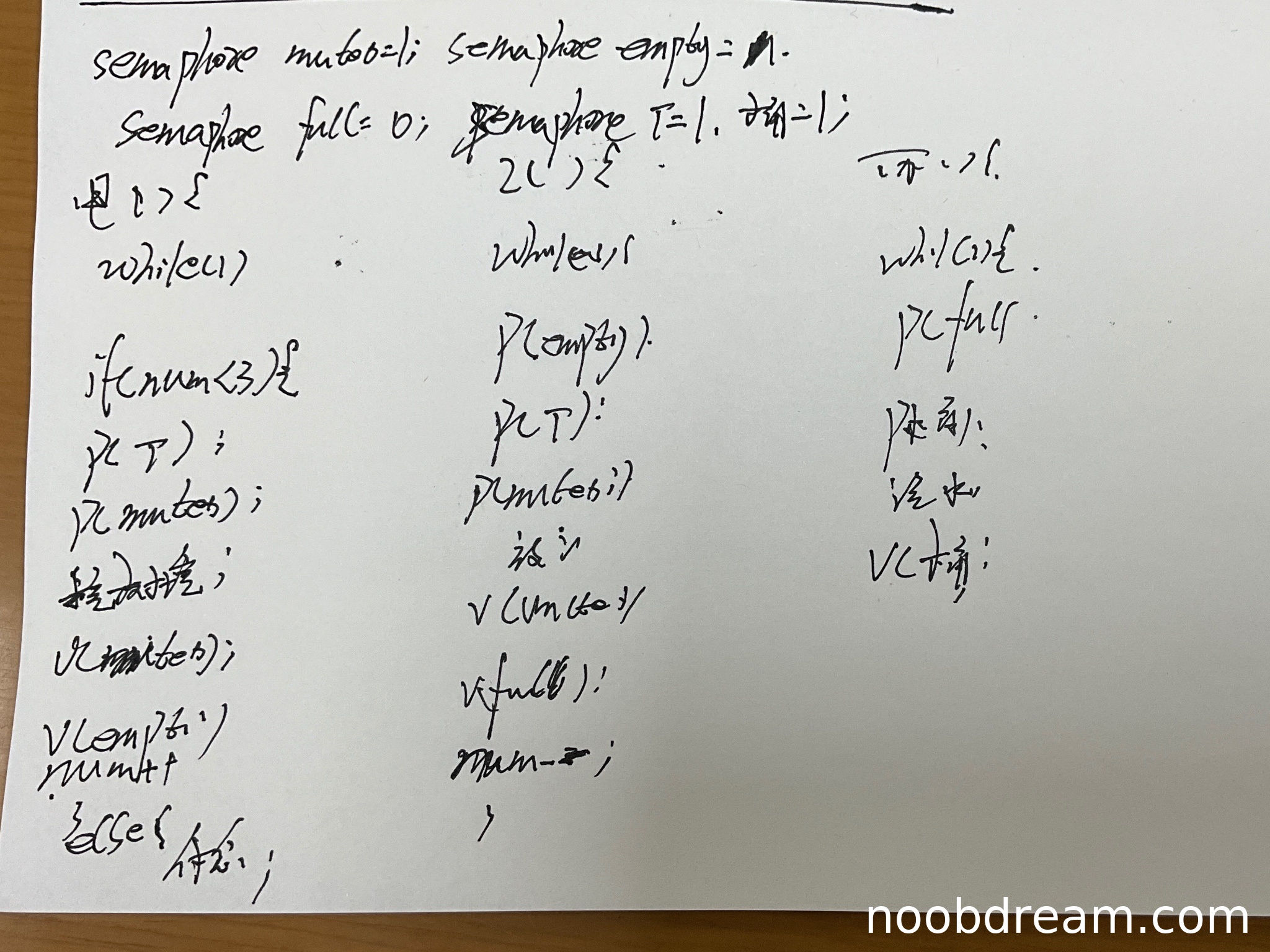 丙进程描述过于简单,缺少对浇水信号量的等待操作,且信号量使用不匹配。扣0.5分。得分:0.5分