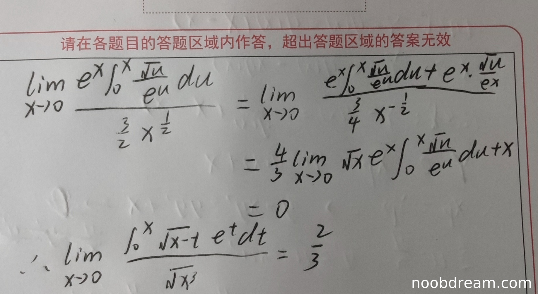 - 在第二次洛必达法则应用中,分子求导后应为 \(e^x \int_0^x \frac{\sqrt{u}}{e^u} du + e^x \cdot \frac{\sqrt{x}}{e^x} + e^x \cdot \frac{\sqrt{x}}{e^x}\)(乘积法则和变上限积分求导组合),但学生只写了一项,导致中间表达式错误。不过最终极限计算为0是正确的(因为分子阶数低于分母)。