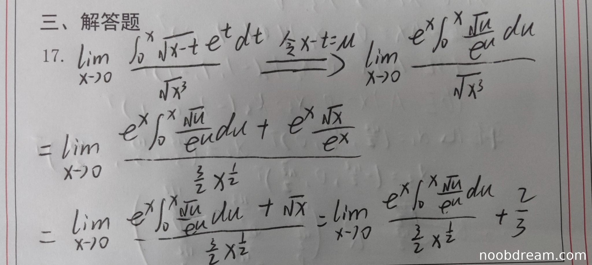 - 在第二次洛必达后的化简中,学生写为 \(\frac{4}{3} \lim_{x\to 0} \frac{\sqrt{x} e^x \int_0^x \frac{\sqrt{u}}{e^u} du + x}{x^{1/2}}\),这里分子分母阶数分析不严谨,但巧合地得到0。