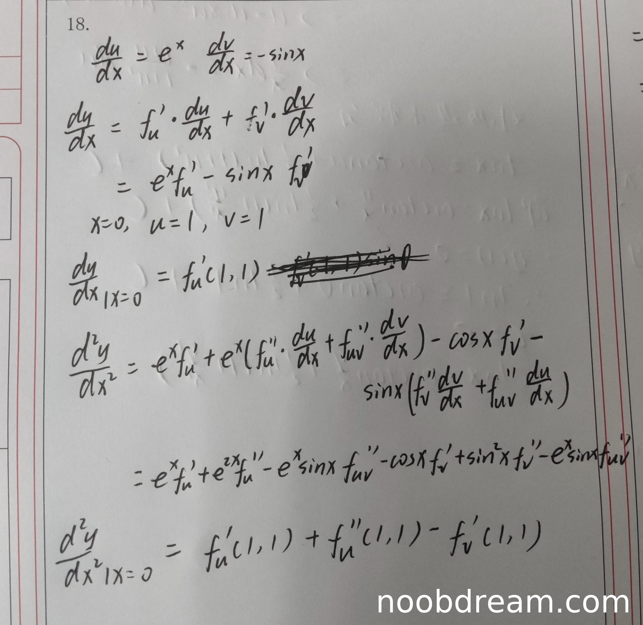 学生计算二阶导数时,虽然求导过程正确,但在最终结果中缺少了f_1'(1,1)项。标准答案为f_11''(1,1)+f_1'(1,1)-f_2'(1,1),而学生答案为f_u'(1,1)+f_uu''(1,1)-f_v'(1,1),其中f_u'(1,1)就是f_1'(1,1),但缺少了单独的一个f_1'(1,1)项。这是一个逻辑错误,扣2分。得3分。