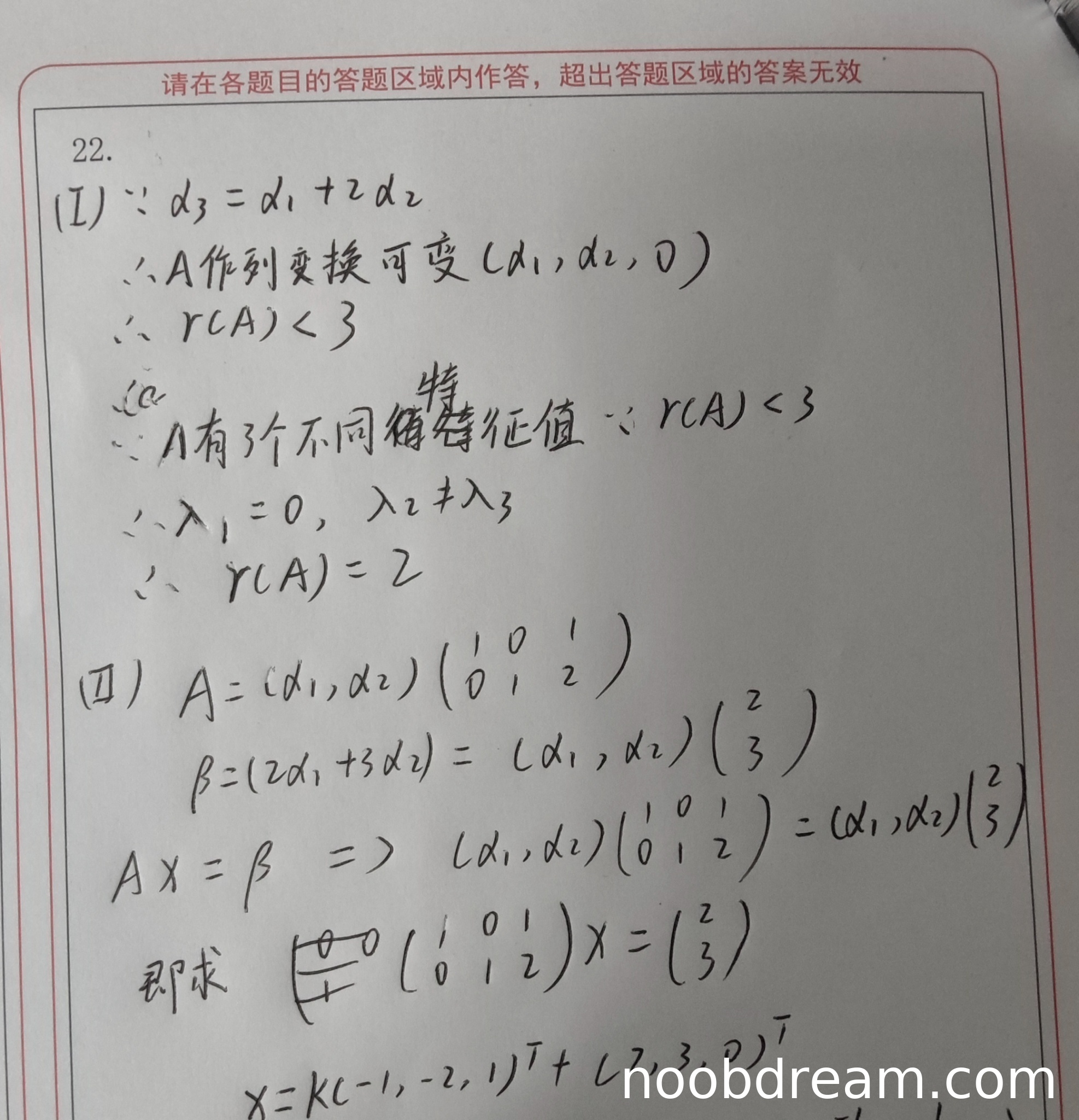 学生作答中,第一段推理存在逻辑错误。学生说“因为A有3个不同的特征值,所以r(A)<3”,这个推理是不正确的。正确的逻辑应该是:由α₃ = α₁ + 2α₂可知A的列向量线性相关,所以|A|=0,从而0是A的特征值。又因为A有3个不同的特征值,所以只有一个特征值为0,另外两个非零,因此r(A)=2。