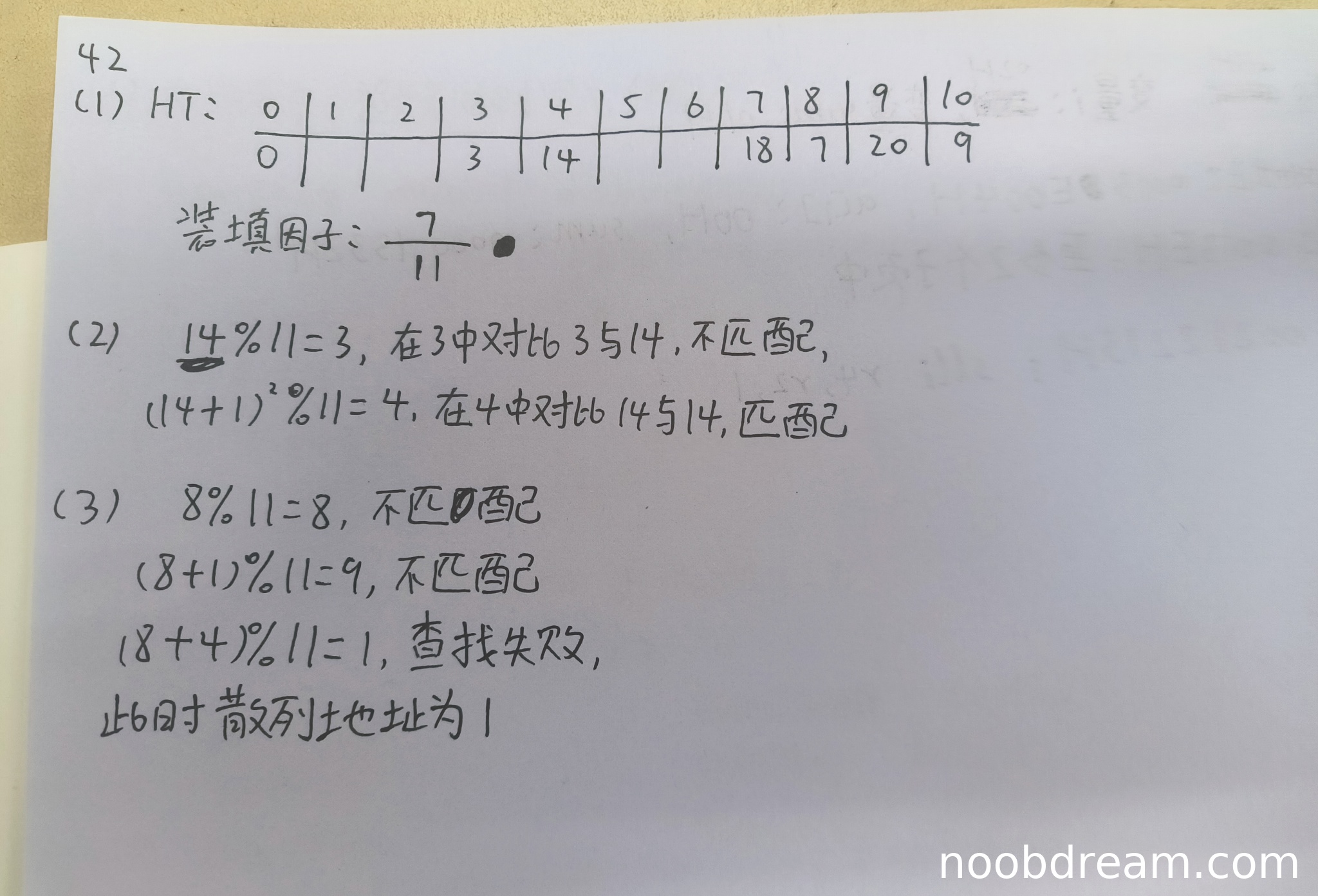 学生答案中散列表HT的构造存在多处错误:地址0处填写0(应为11),地址3处填写3(应为7),地址4处填写14(应为空),地址5处为空(应为20),地址6处为空(应为9),地址7处填写18(应为空),地址9处填写20(应为3),地址10处填写9(应为18)。装填因子计算为7/11正确。由于散列表构造完全错误,但装填因子计算正确,给1分。