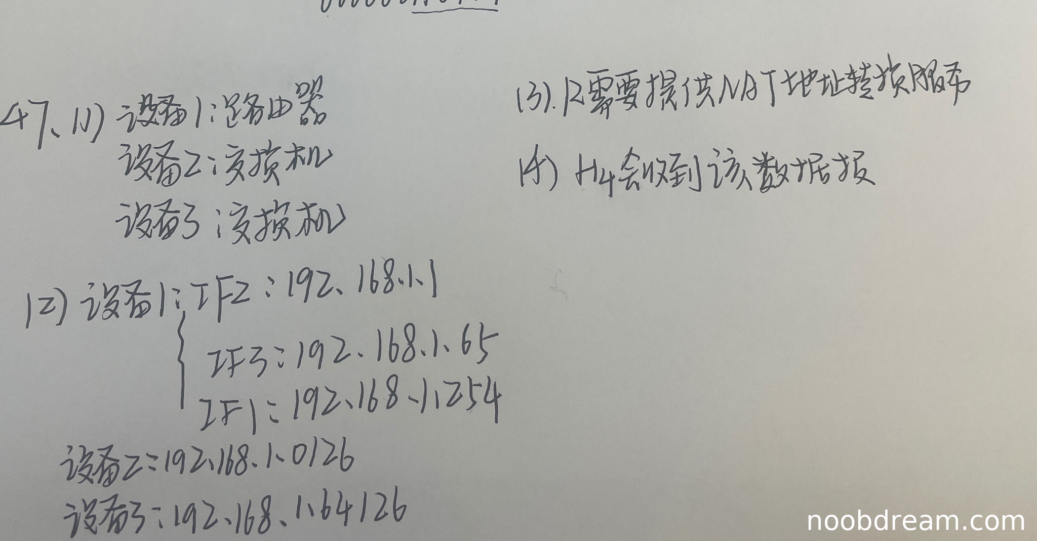 学生正确指出设备1需要配置IP地址,并给出了设备1三个接口的正确IP地址(192.168.1.1、192.168.1.65、192.168.1.254)。但错误地为设备2和设备3配置了IP地址(192.168.1.0126和192.168.1.64126),而标准答案中交换机不需要配置IP地址。由于核心要求是"哪几个设备需要配置IP地址",学生正确识别了设备1,但额外错误配置了其他设备。考虑到主要得分点(设备1的识别和正确IP配置)已覆盖,但存在逻辑错误(给交换机配IP),扣1分。得3分。