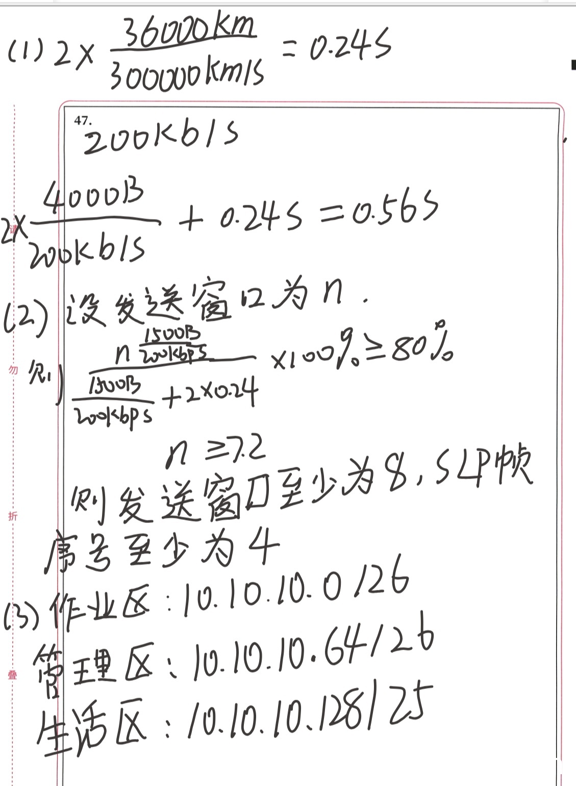 学生正确列出信道利用率公式,但计算时误将传播时延取为0.24s(应为0.12s),导致发送窗口计算结果错误(n≥7.2,取8)。帧序号计算正确(4)。核心逻辑部分错误,扣1分。得2分。