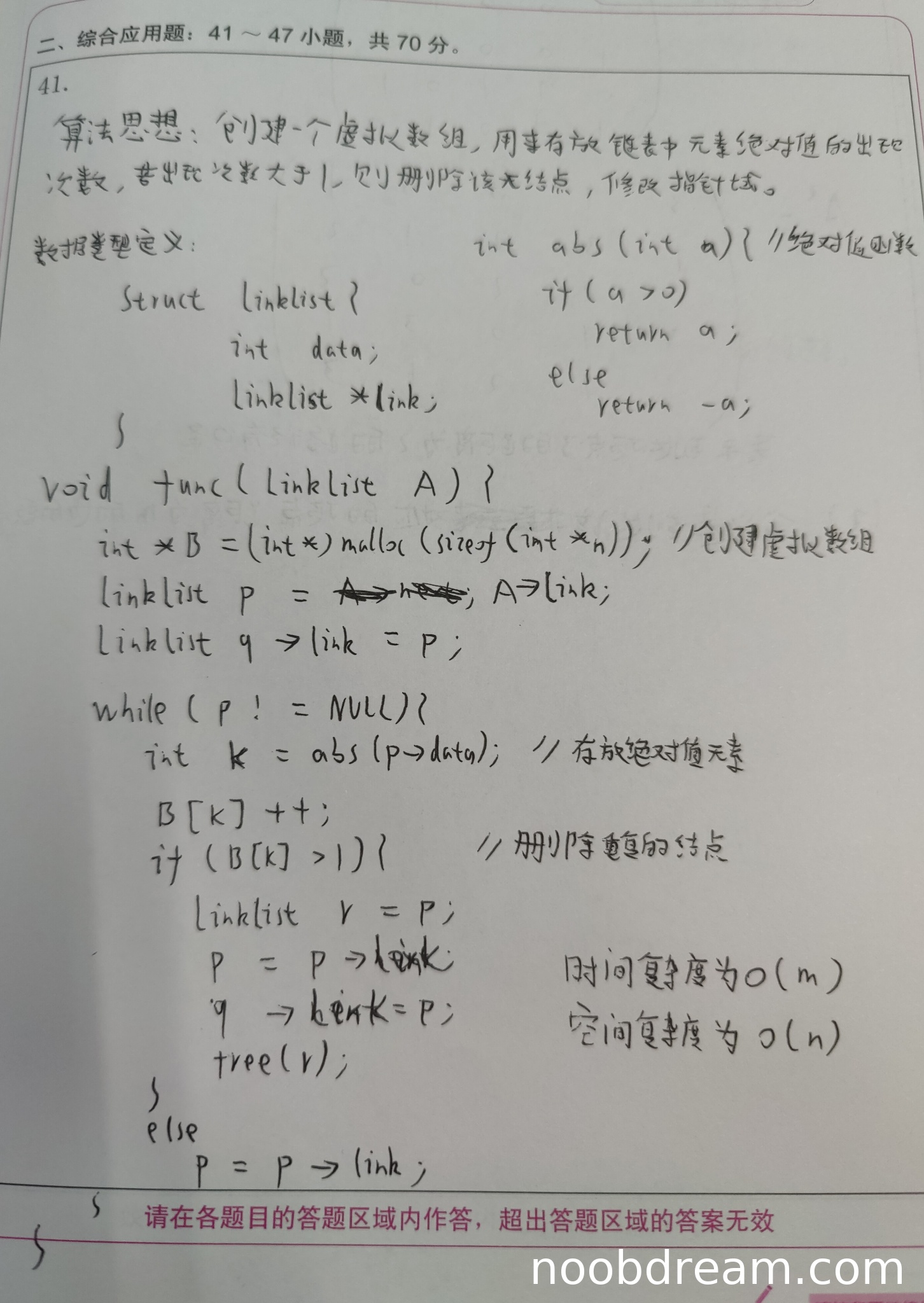 理由:时间复杂度和空间复杂度分析正确,O(m)和O(n)的结论与标准答案一致。
