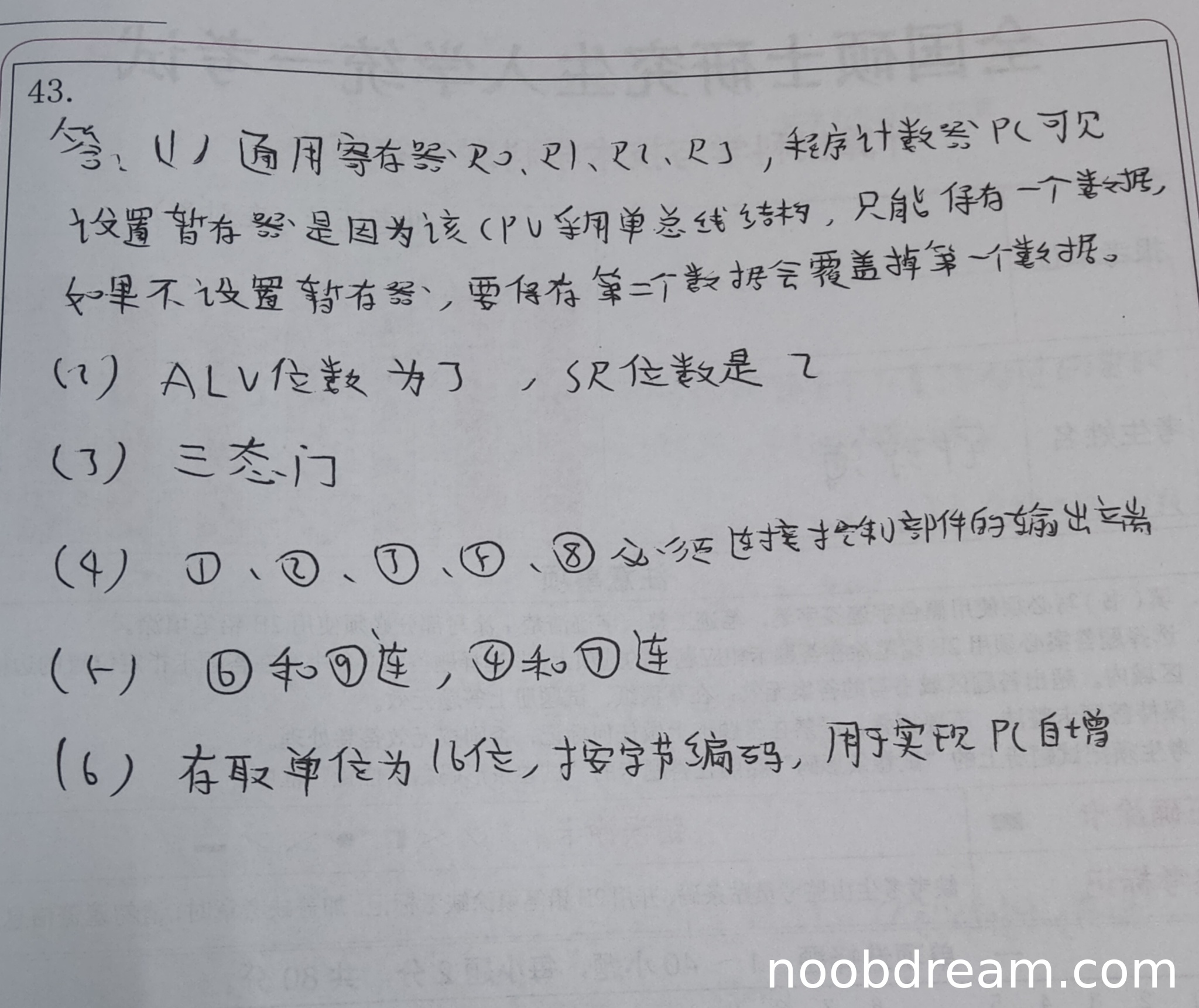 学生回答"ALU位数为3,SR位数是2"完全正确。ALU有7种操作需要3位控制信号,SR有3种操作需要2位控制信号。得2分。