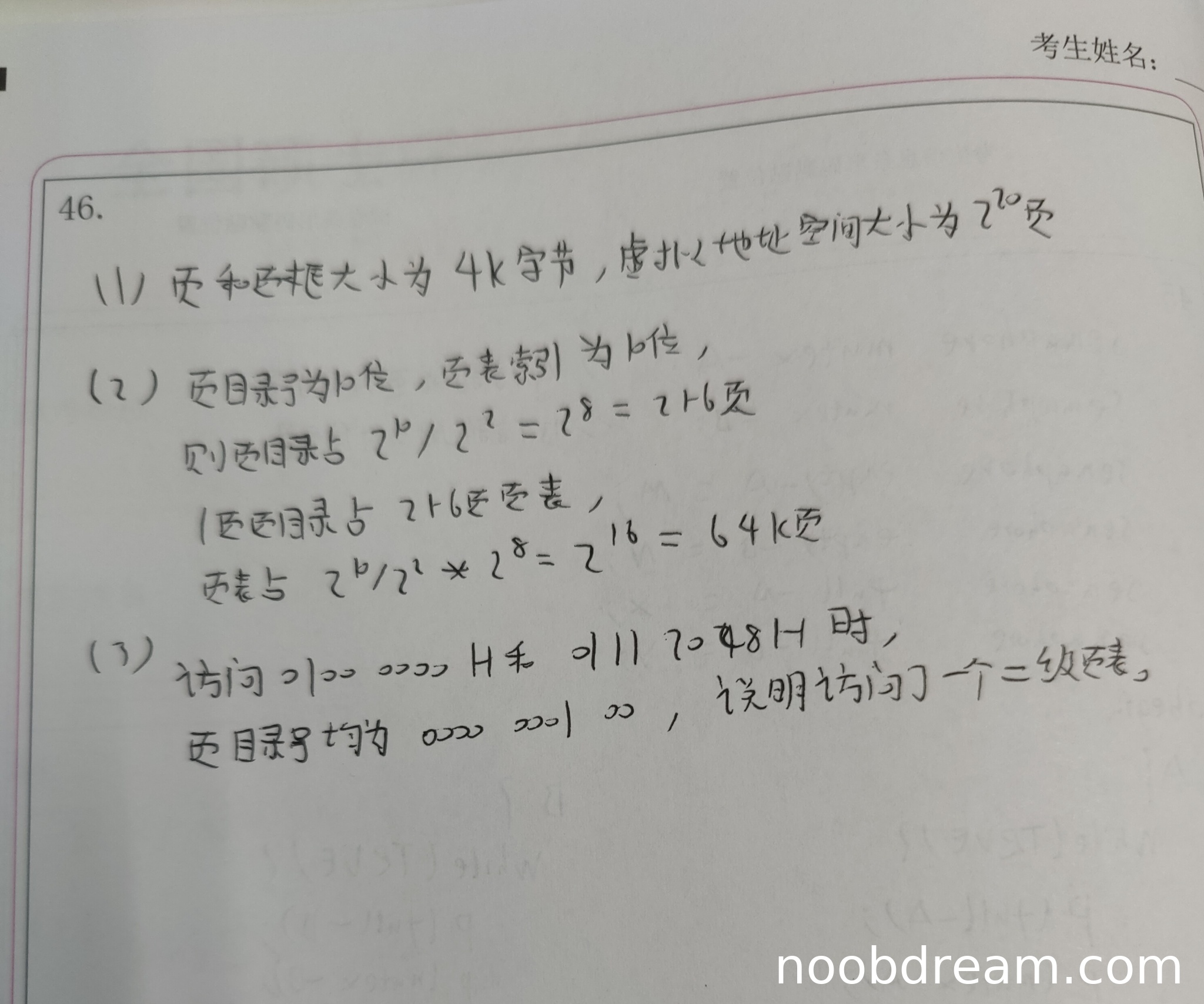 学生正确指出两个虚拟地址的页目录号相同(均为0000 0001 00),因此只需要访问一个二级页表(得2分)。虽然学生将"2048H"误写为"7048H",但根据上下文判断这是识别错误,且不影响页目录号的计算,因此不扣分。本小题得2分。