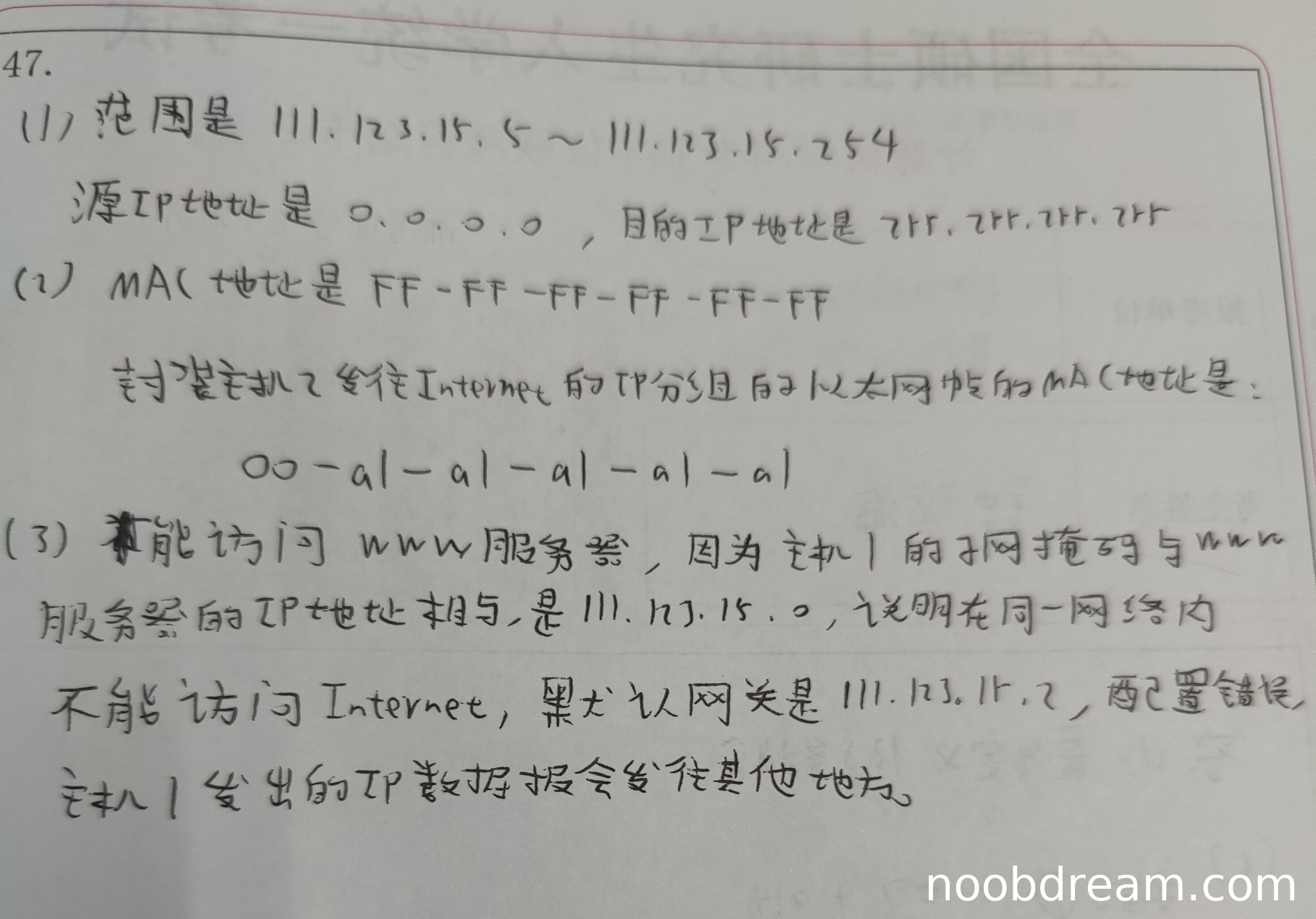 学生答案正确指出了DHCP地址分配范围为111.123.15.5~111.123.15.254,以及DHCP Discover报文的源IP地址为0.0.0.0、目的IP地址为255.255.255.255。这些内容与标准答案完全一致,因此得3分。