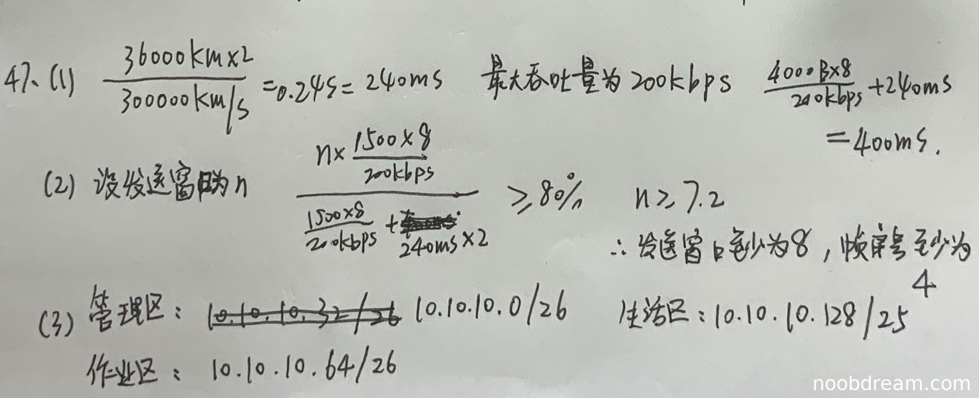 学生第一问计算单向传播时延时使用了往返距离(36000km×2),但题目要求的是单向传播时延,应为36000/300000=0.12s=120ms。学生计算得到240ms,这是错误的,扣1分。最大吞吐量200kbps正确,得1分。文件传输时间计算中,学生使用了错误的传播时延240ms,正确应为120ms,且计算式应为4000×8/200k+120ms=160ms+120ms=280ms,学生得到400ms错误,扣1分。本小题得1分。