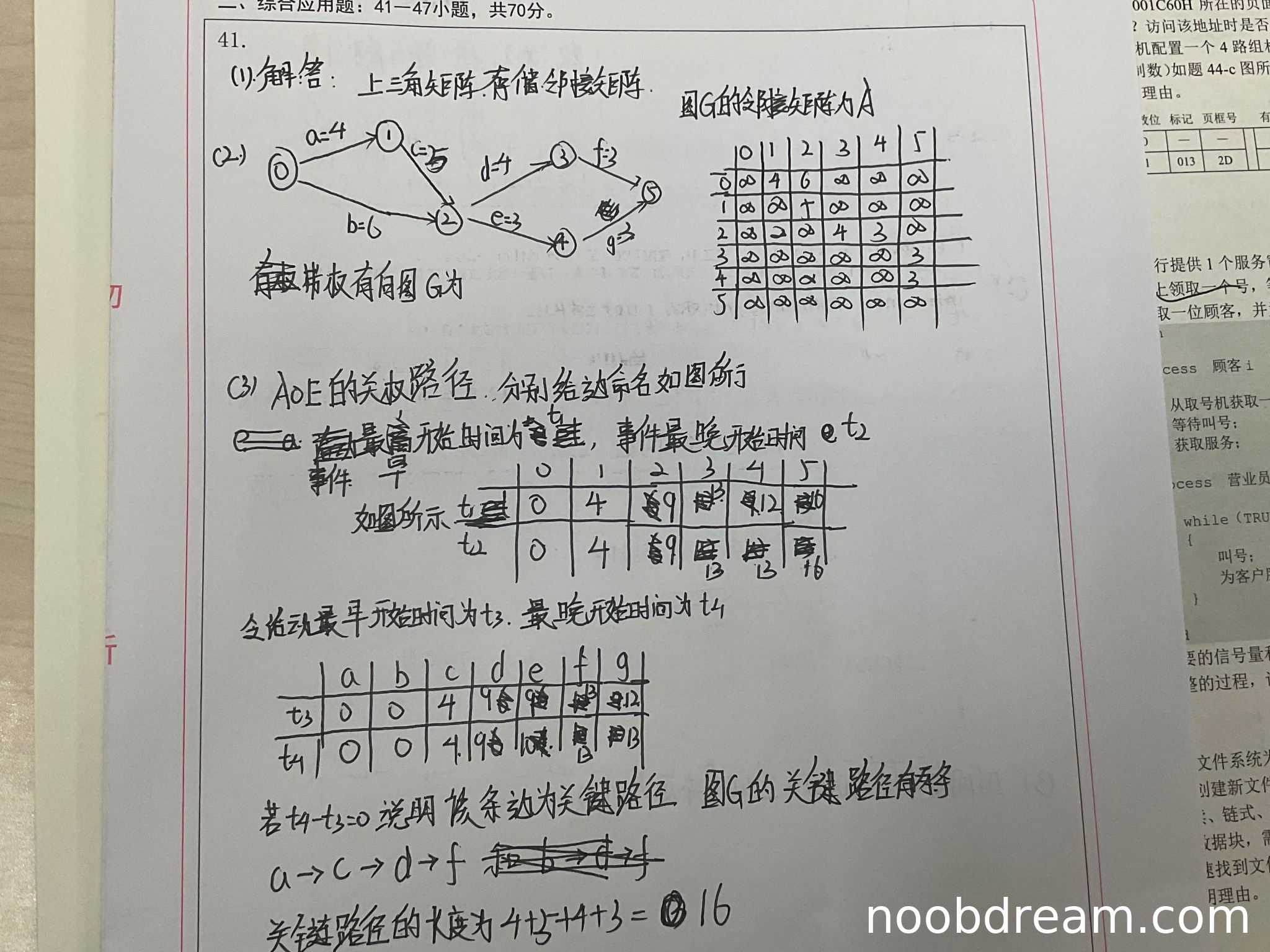 学生计算了关键路径长度16与标准答案一致,但关键路径的识别存在问题: