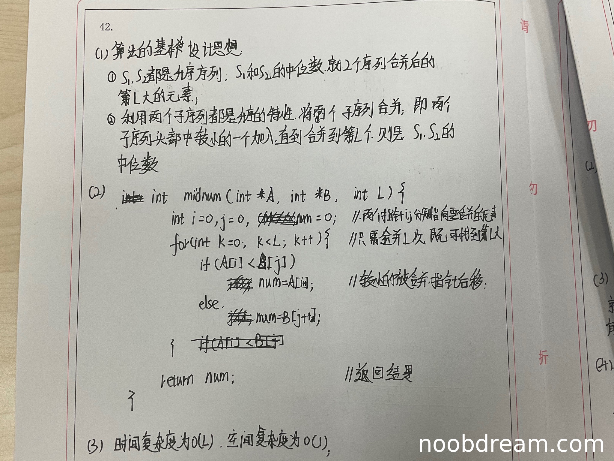 理由:学生的基本设计思想是采用合并排序的思路,通过逐个比较两个序列的元素来找到第L大的元素。但题目要求的是两个等长升序序列的中位数,根据题目定义,两个序列的中位数应该是合并后序列的第L个元素(因为总长度为2L,中位数是第L个)。然而,学生的思路虽然能正确找到中位数,但时间复杂度为O(L),而标准答案采用二分查找思想,时间复杂度为O(log₂n),明显更高效。题目要求"在时间和空间两方面都尽可能高效的算法",学生的算法在时间效率上未达到最优,因此不能得分。