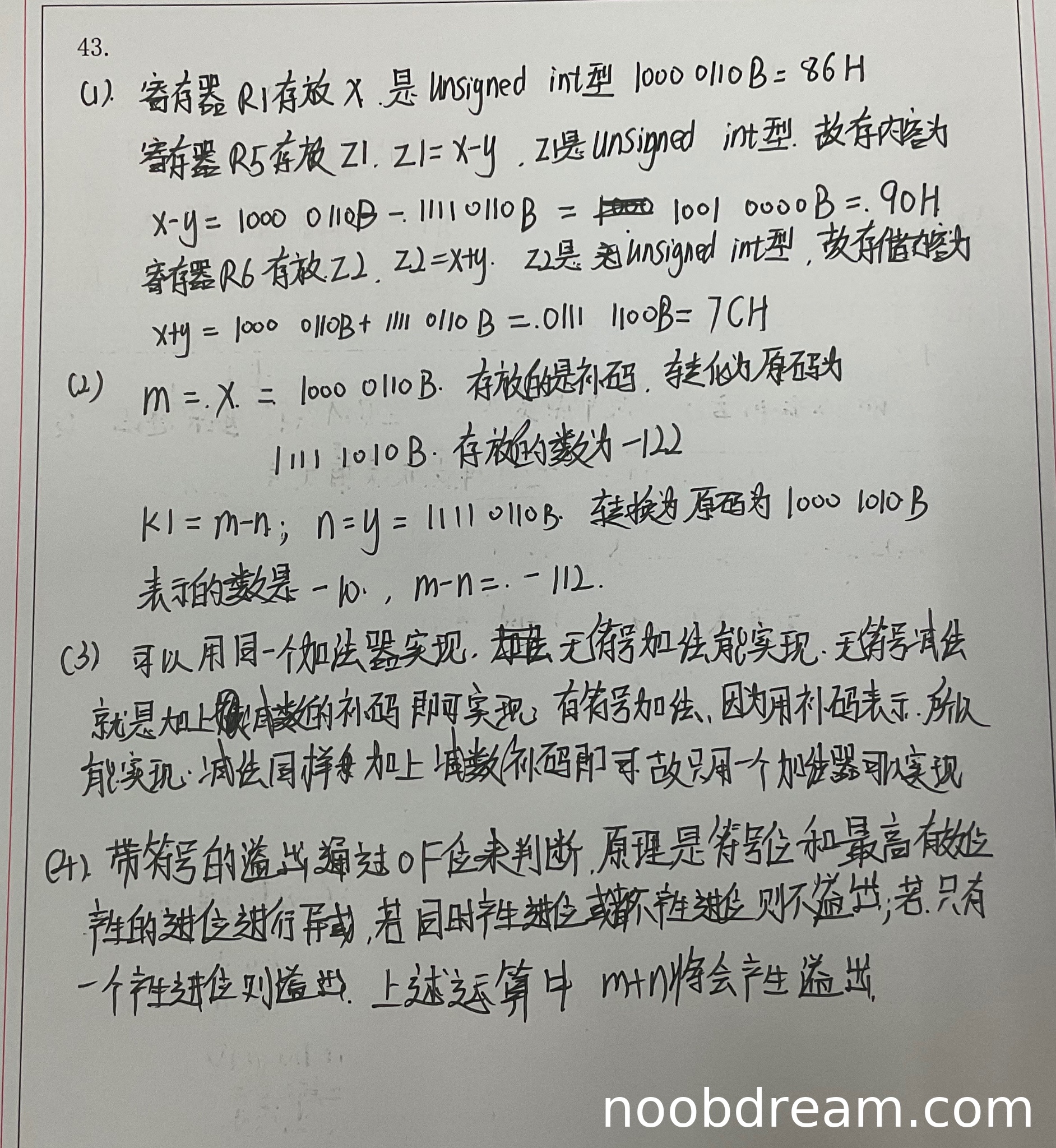 学生回答"可以用同一个加法器实现",理由正确:无符号数和有符号数都以补码形式存储,加减运算在电路层面相同(减法通过补码加法实现)。虽然未详细说明溢出判断电路可能不同,但核心原理正确,不扣分,得2分。