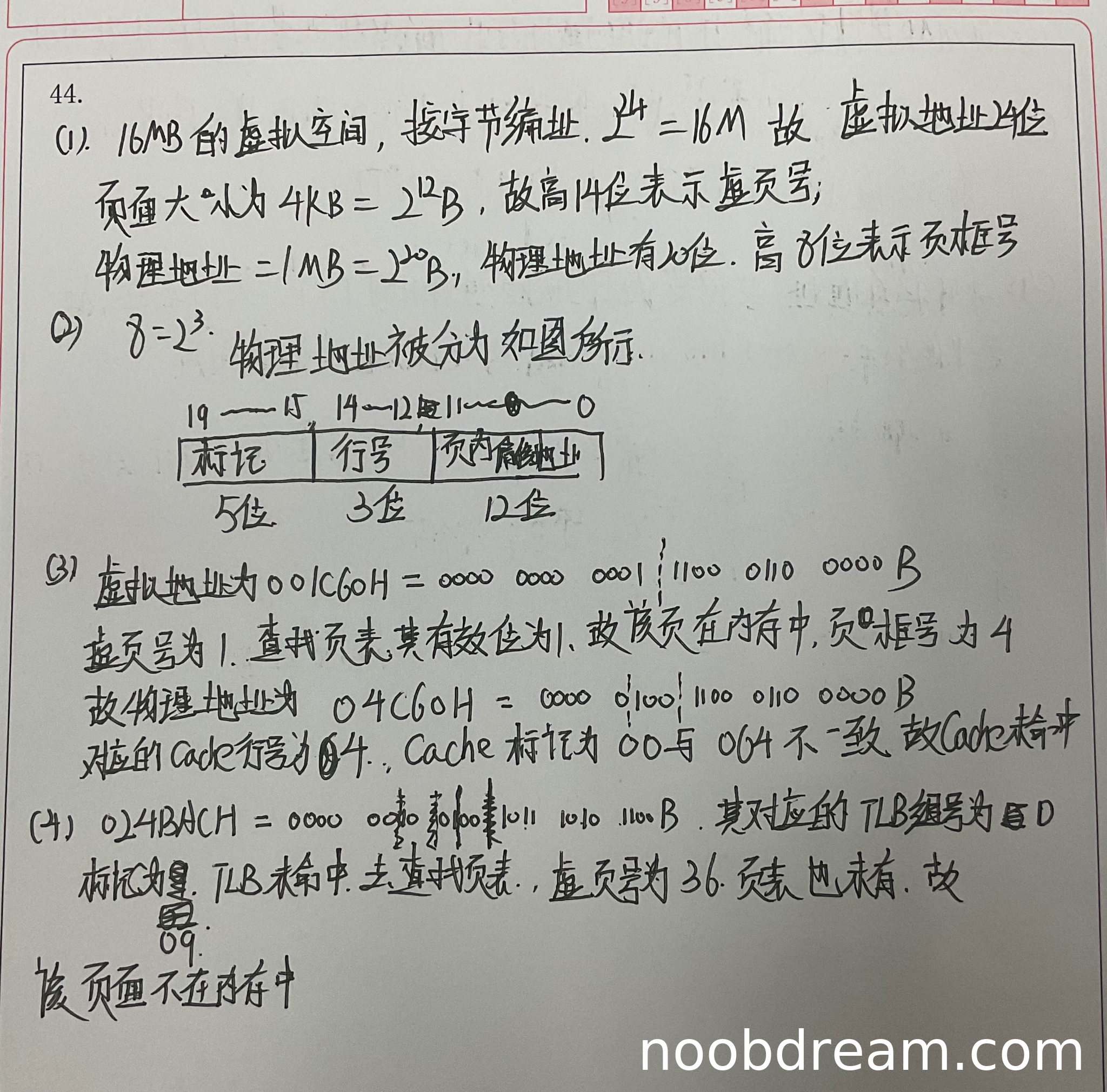 学生正确判断虚拟地址001C60H在主存中(虚页号1,有效位1,页框号4),并计算出物理地址04C60H,这部分正确。但在Cache命中判断中,学生计算Cache行号为04(十六进制),而标准答案为行号3(十进制)。直接映射方式下行号计算:物理地址04C60H二进制为0000 0100 1100 0110 0000,块大小32B,故块内地址低5位;Cache共8行,故行号字段为接下来3位(即第5-7位),从低到高地址依次为块内地址(5位)、行号(3位)、标记(12位)。04C60H二进制中,行号字段为011(从低到高第5-7位),即行号3。学生行号计算错误,导致标记比较对象错误,但比较结果正确(未命中),因此扣1分。其他部分正确,得3分。