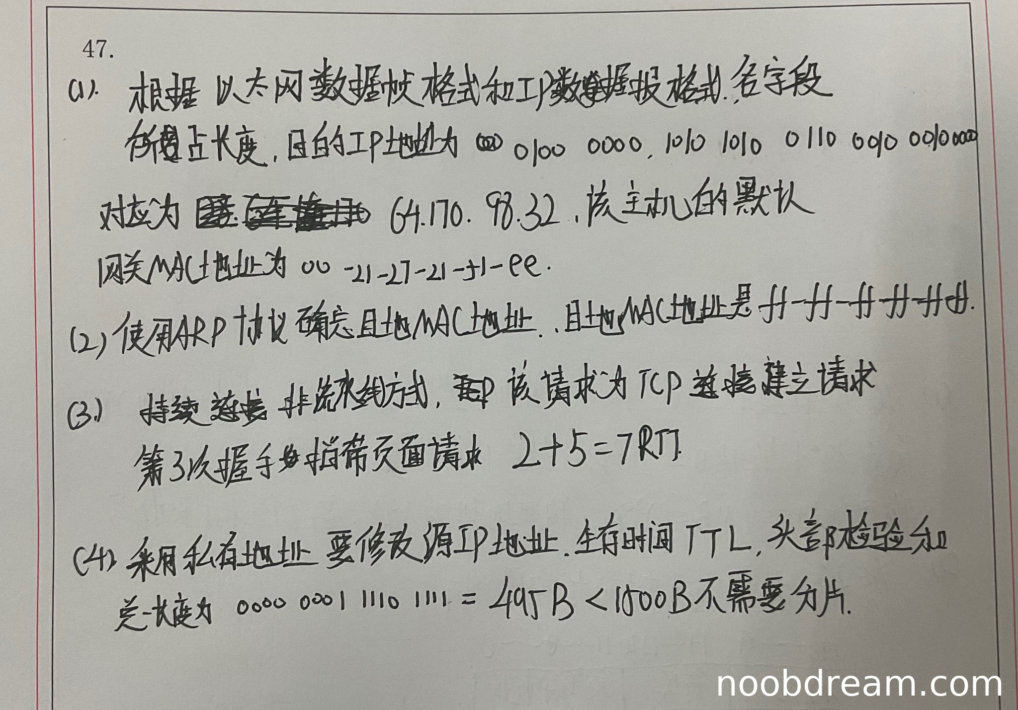 学生正确指出使用ARP协议确定目的MAC地址,并正确指出ARP请求报文的目的MAC地址为ff-ff-ff-ff-ff-ff(广播地址)。答案与标准答案完全一致,得2分。