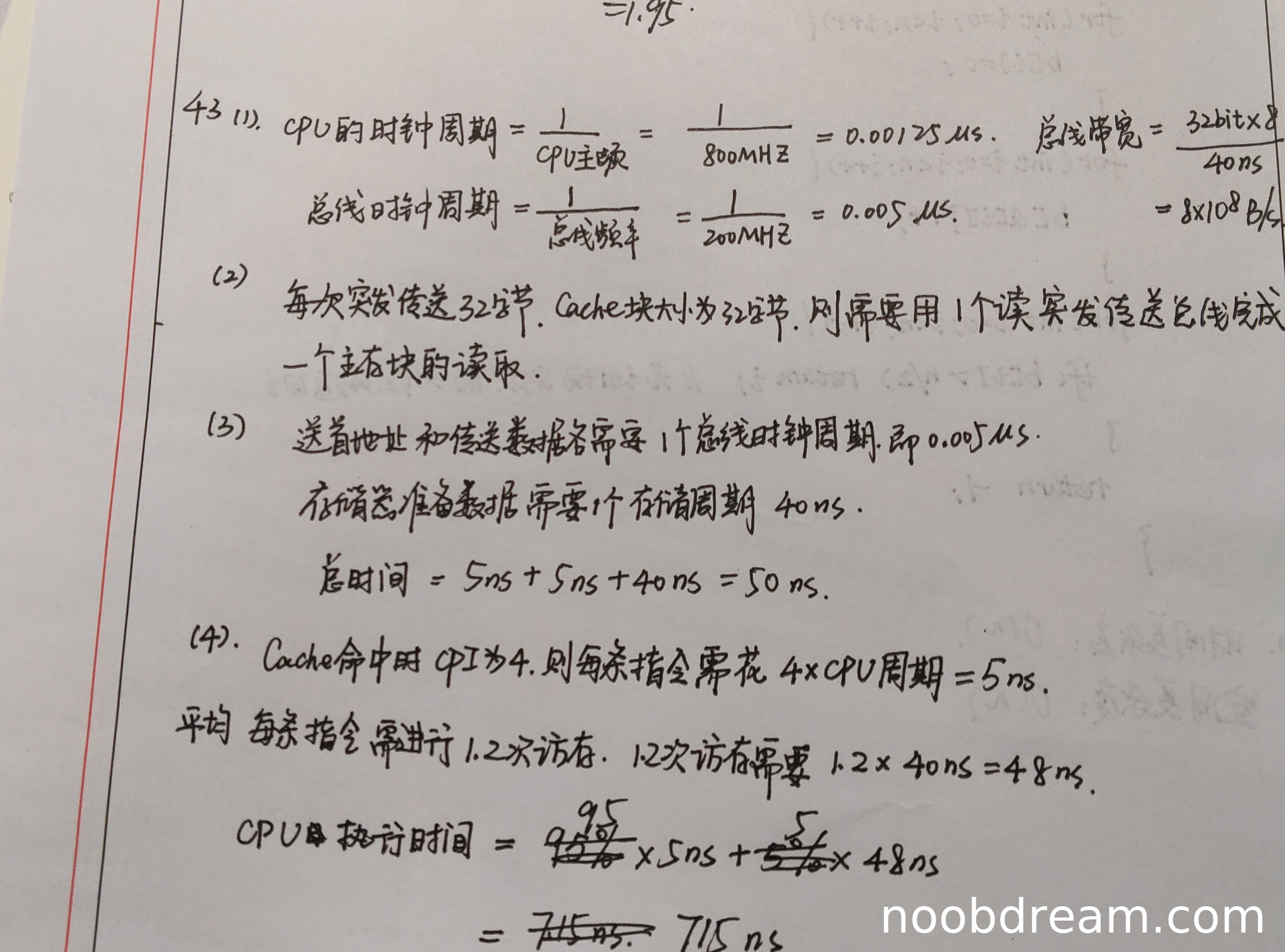 CPU时钟周期计算正确(1.25ns,学生答案中0.00125μs=1.25ns),得1分;总线时钟周期计算正确(5ns,学生答案中0.005μs=5ns),得1分;总线带宽计算错误(学生计算为8×10⁸ B/s,标准答案为800 MB/s,学生计算过程有误),扣1分。本小题得2分。