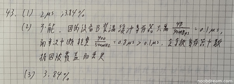 标准答案:不能,因为中断处理时间(0.8μs)大于设备准备数据时间(0.1μs)