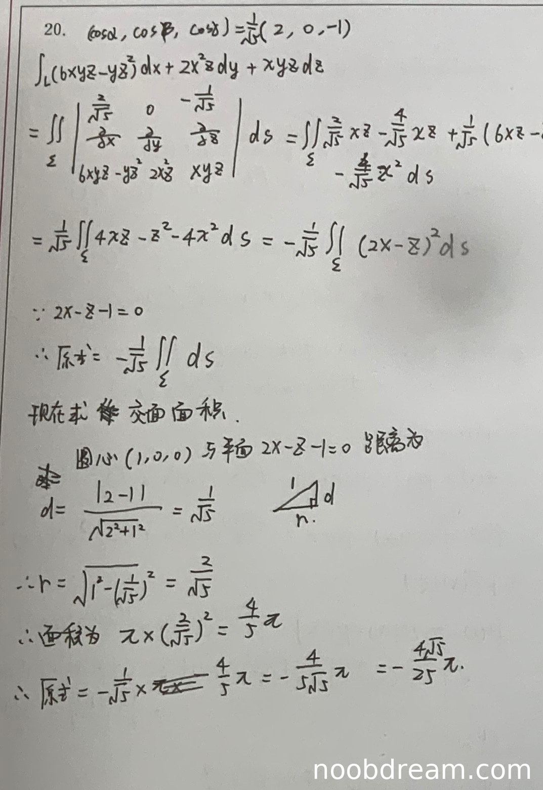 学生正确利用了已知平面方程2x-z-1=0,即2x-z=1,将被积函数(2x-z)²简化为1²=1,使曲面积分简化为-1/√5∬dS。此部分推导正确,得4分。