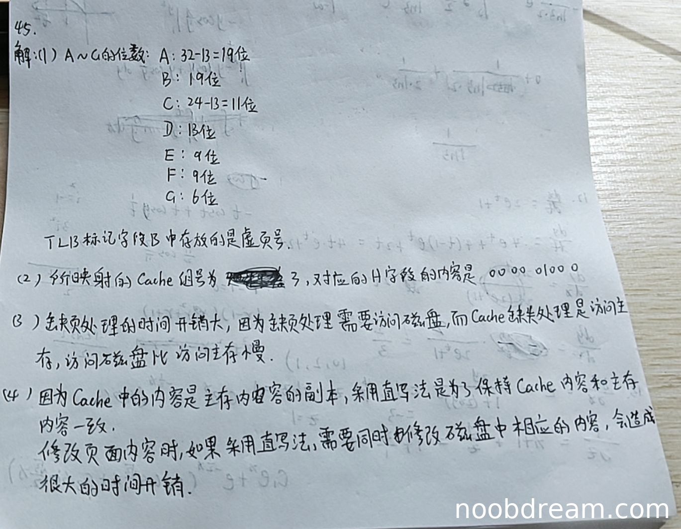 学生正确计算了A~G的位数:A=19、B=19、C=11、D=13、E=9、F=9、G=6(每个1分,共7分)。同时正确指出TLB标记字段B存放的是虚页号(1分)。因此本小题得8分。