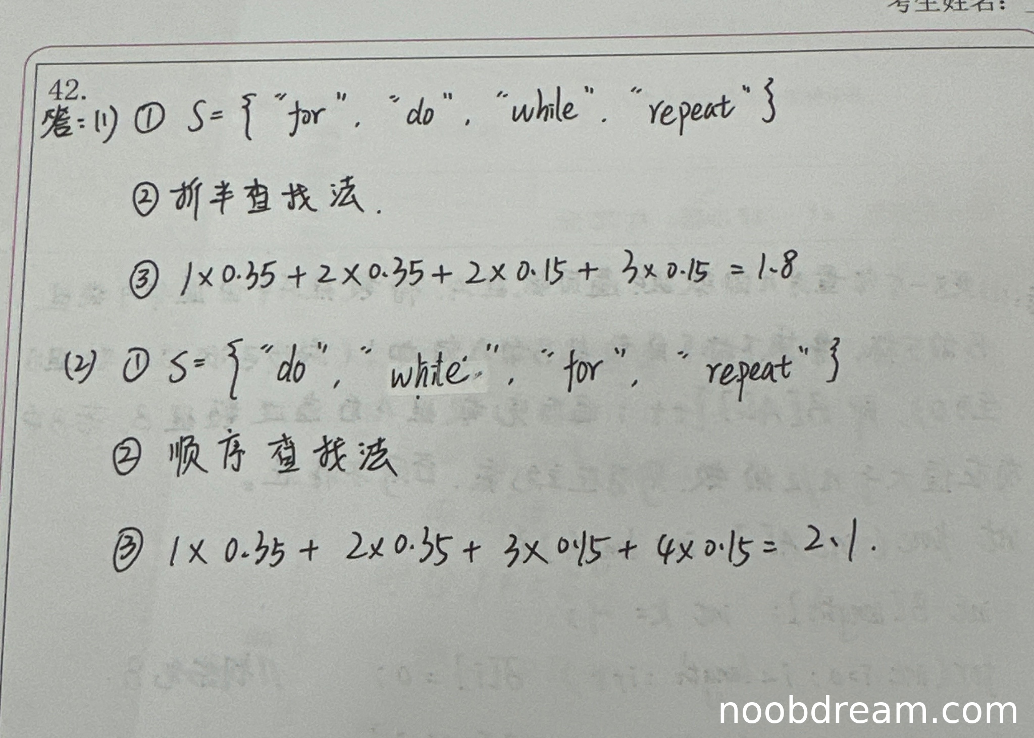 - 元素排列为{"for", "do", "while", "repeat"},这实际上是将查找概率较高的"do"和"while"(各0.35)放在中间位置,而概率较低的"for"和"repeat"(各0.15)放在两端,这种排列并不是按查找概率降序排列,不符合顺序存储结构下最优排列的要求。