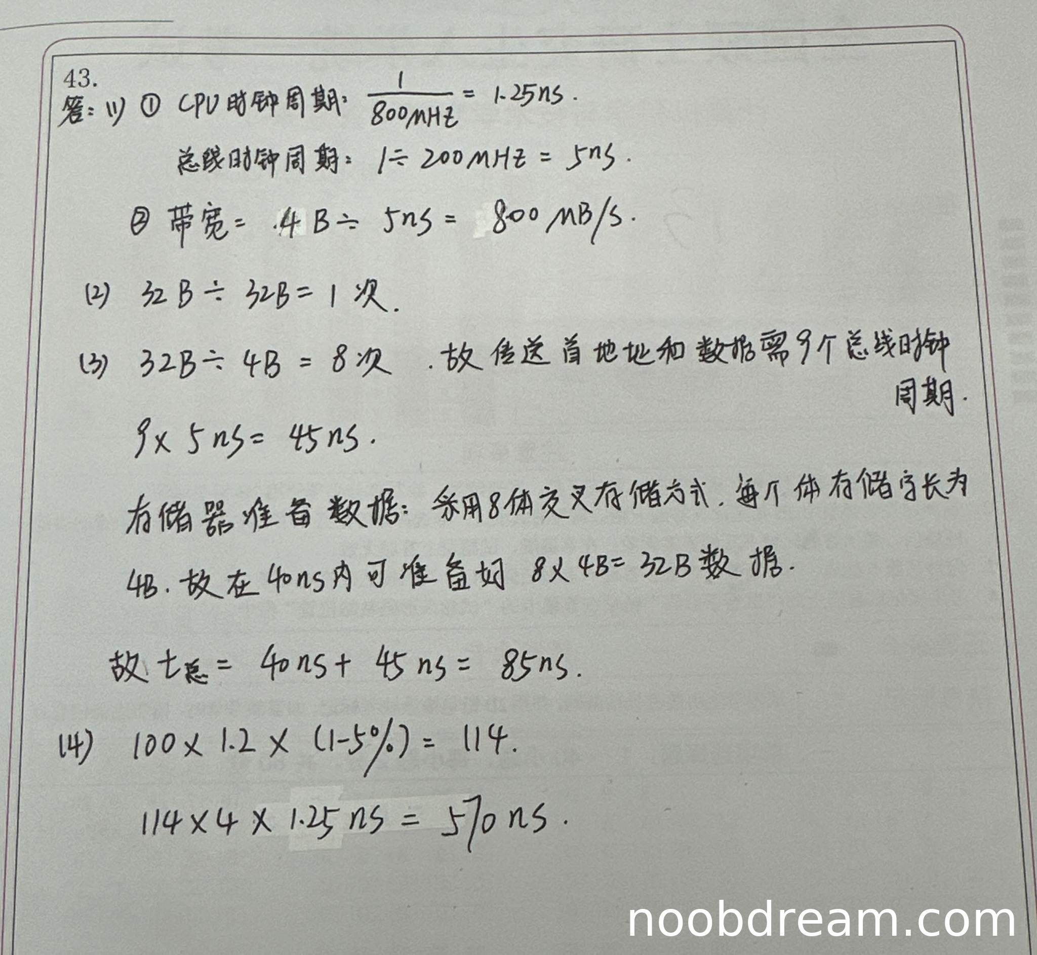 学生正确计算了CPU时钟周期(1.25 ns)、总线时钟周期(5 ns)和总线带宽(800 MB/s),与标准答案一致。得3分。