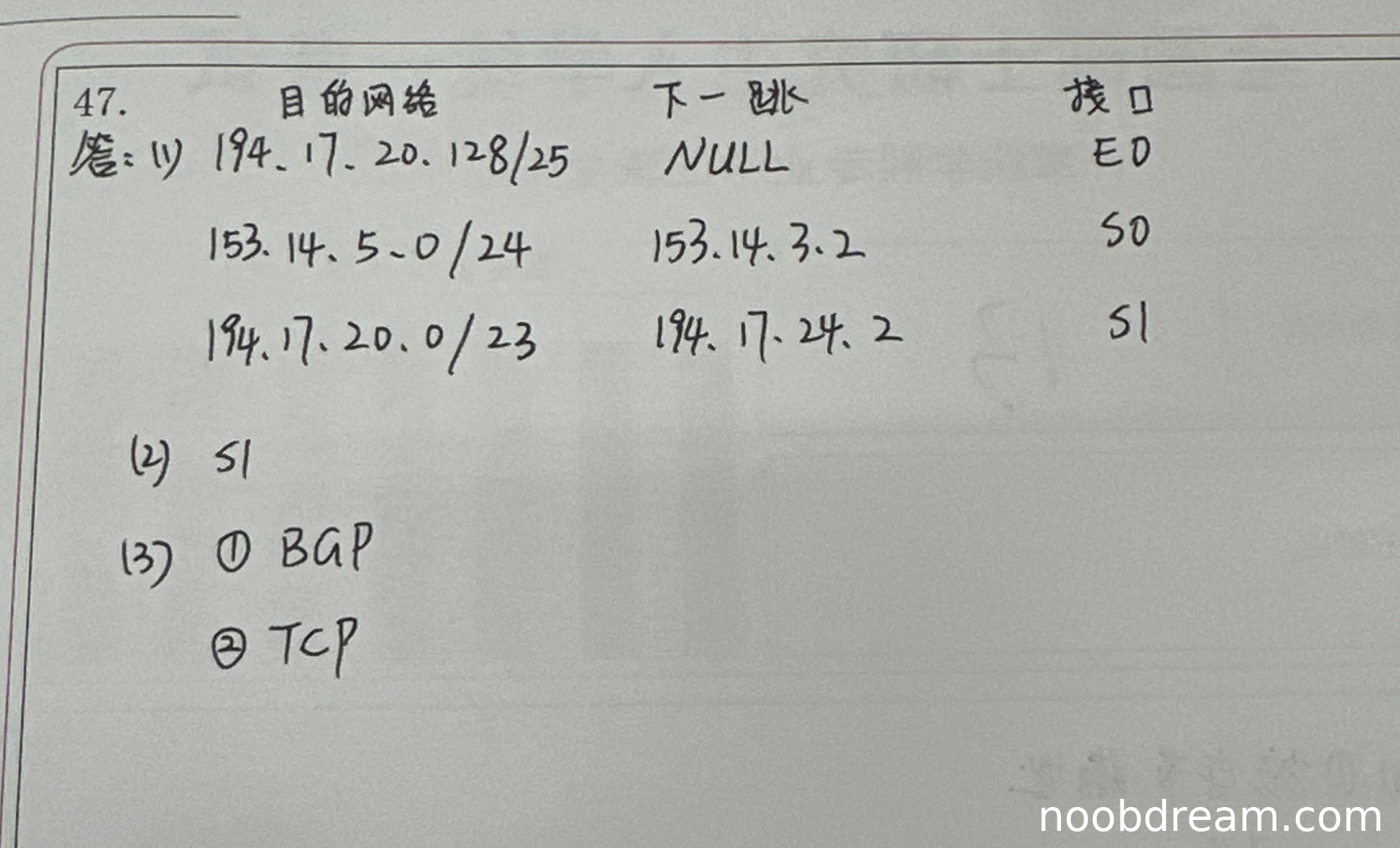 学生答案给出的是S1。但根据最长匹配原则,目的IP地址194.17.20.200与194.17.20.128/25(掩码长度25)和194.17.20.0/23(掩码长度23)都匹配,应选择更具体的194.17.20.128/25,对应接口E0。学生答案S1错误。因此本小题得0分。