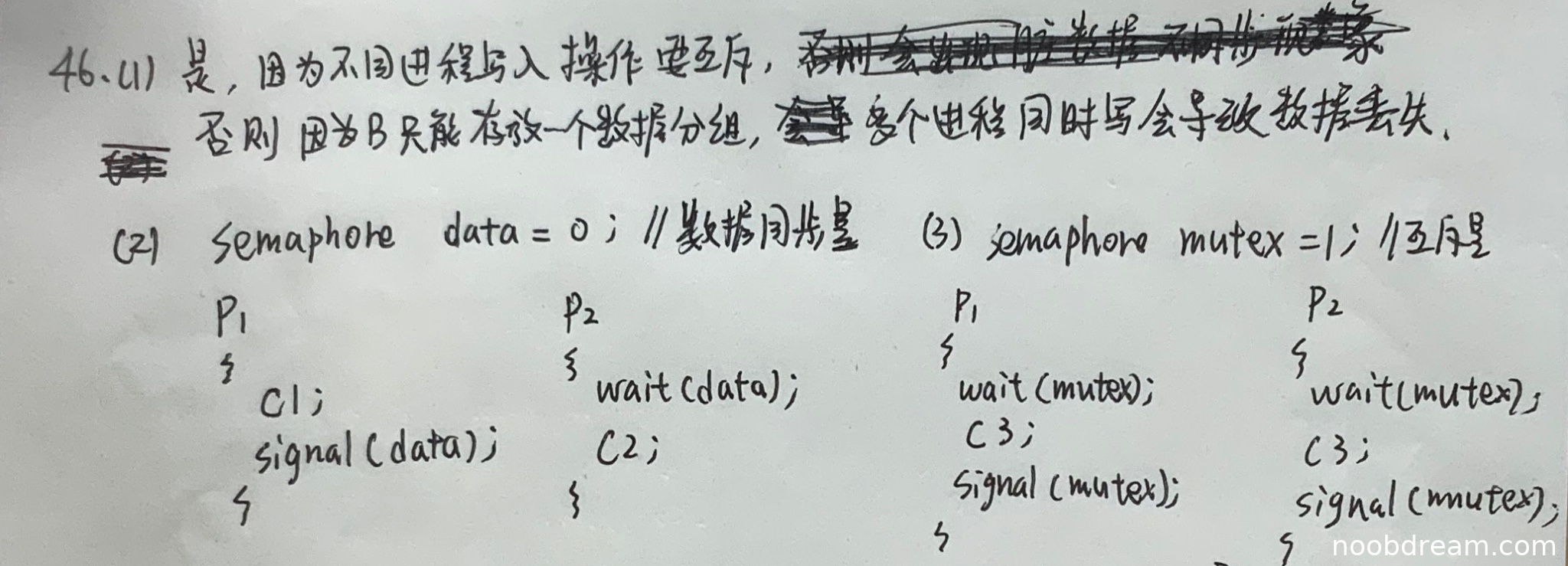 学生正确使用了mutex=1信号量来实现互斥,P1和P2都通过wait(mutex)和signal(mutex)来保护C3操作。这与标准答案完全一致,能够确保同一时刻只有一个进程执行C3。得3分。
