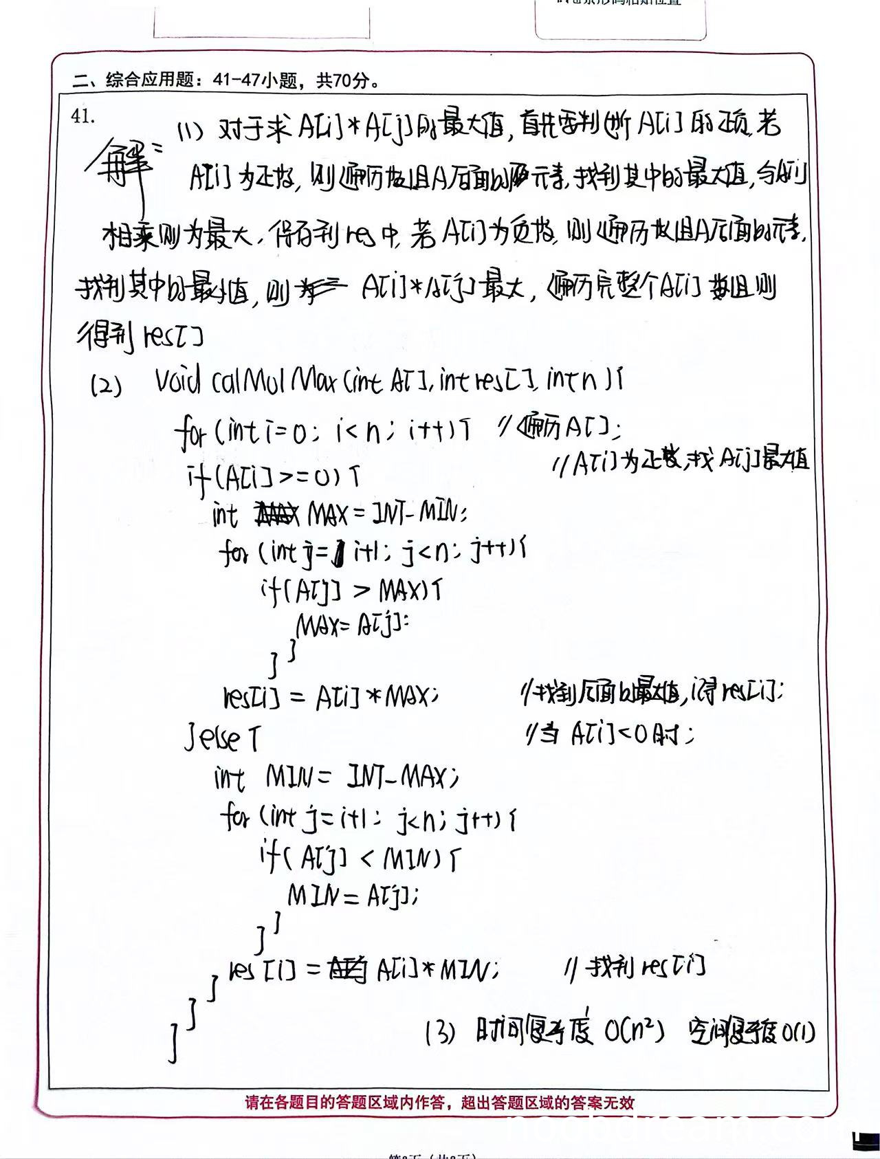 理由:学生的基本设计思想与标准答案一致。正确指出当A[i]为正数时,需要找后面元素的最大值;当A[i]为负数时,需要找后面元素的最小值。思路清晰完整,符合题目要求。