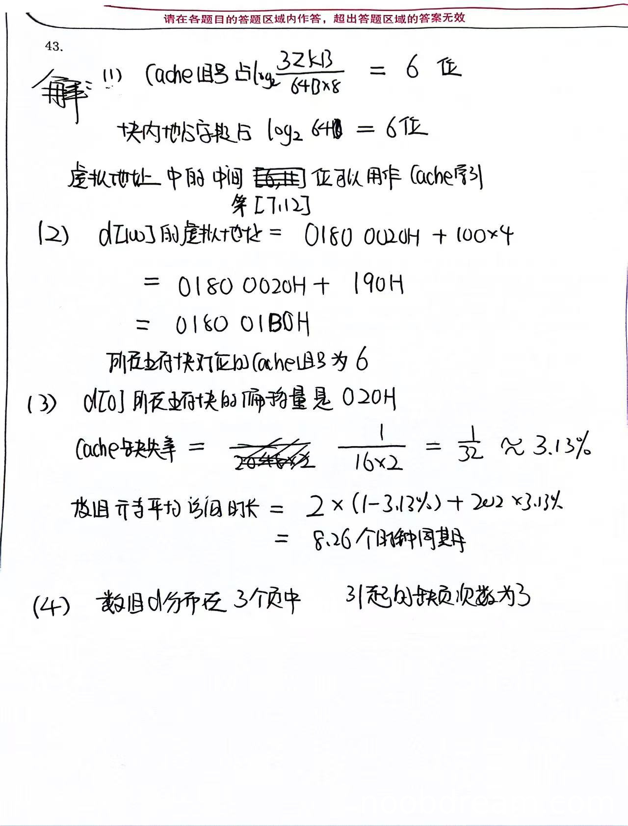 学生正确计算了d[0]的偏移量为020H(1分)。Cache缺失率的计算思路与标准答案不同:学生使用1/(16×2)=1/32≈3.13%,这是基于每个主存块有16个元素(64B/4B=16)且每个元素有读写两次访问的简化计算;而标准答案基于实际主存块数量129和总访问次数4096计算得到3.15%。虽然结果略有差异,但思路合理且计算正确(2分)。平均访问时间计算正确(2分)。总计得5分。