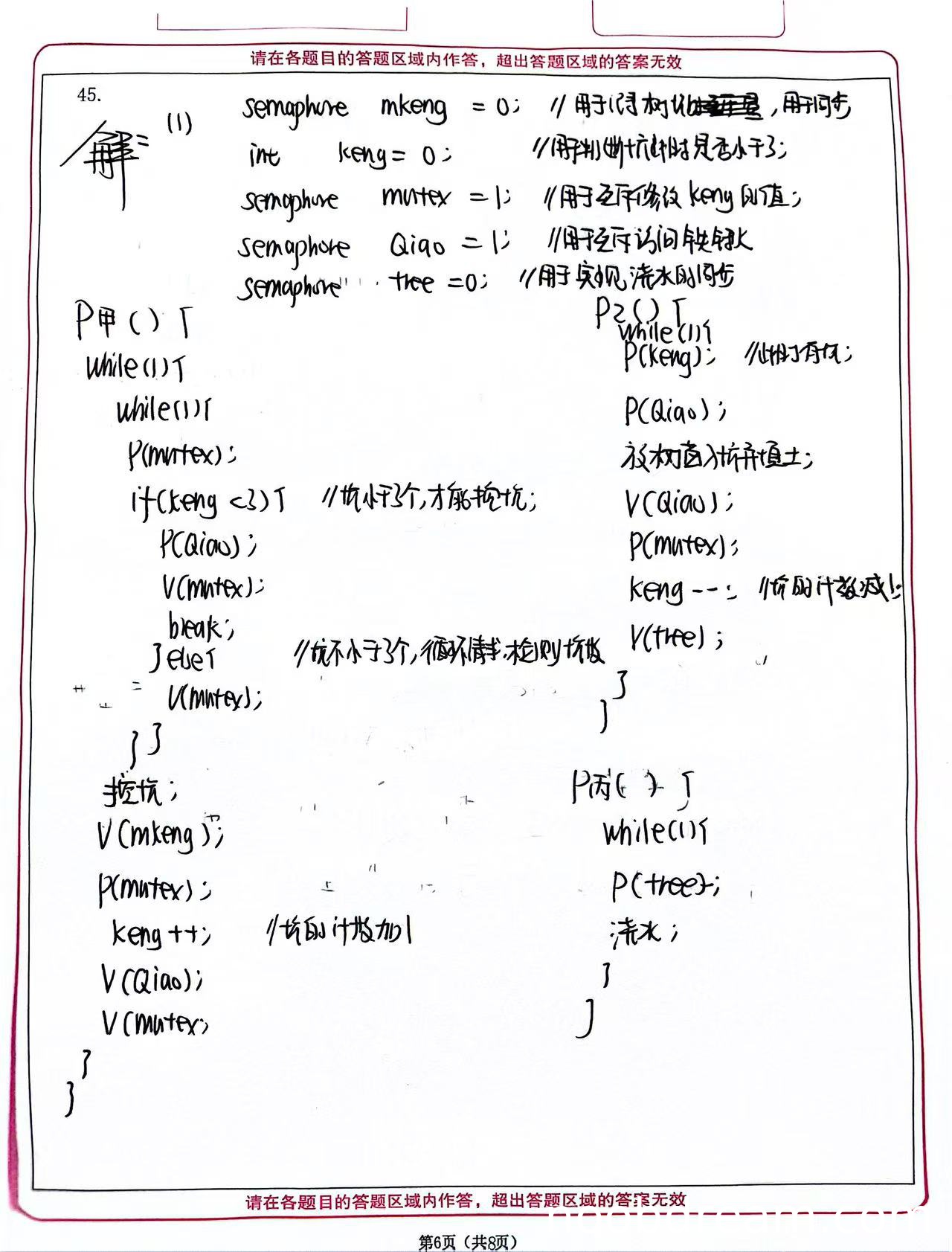 - 在甲进程中,使用while循环和if条件判断keng<3来实现"树坑数量小于3时才可以挖坑"的要求,这种方法虽然功能上可以实现,但效率较低(忙等待),且不符合题目要求使用信号量进行同步的意图。标准答案使用sk信号量直接控制可挖坑数量更为合理。