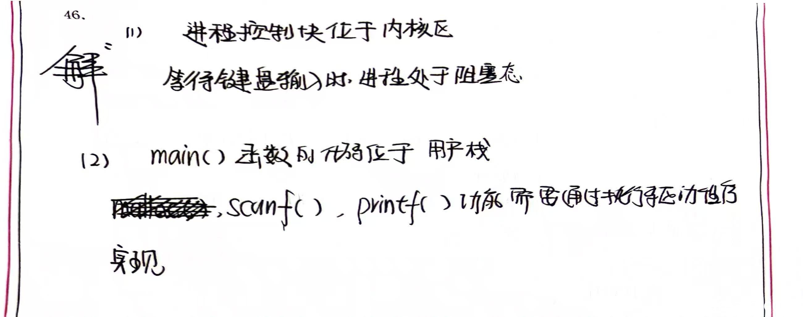 学生答案存在错误:main()函数的代码位于用户栈(错误,应位于只读代码段)。但正确指出了scanf()和printf()需要通过执行系统调用实现(系统调用需要驱动程序支持,因此符合要求)。由于main()函数位置错误,扣1分;函数调用部分正确,得2分。本小题最终得2分。