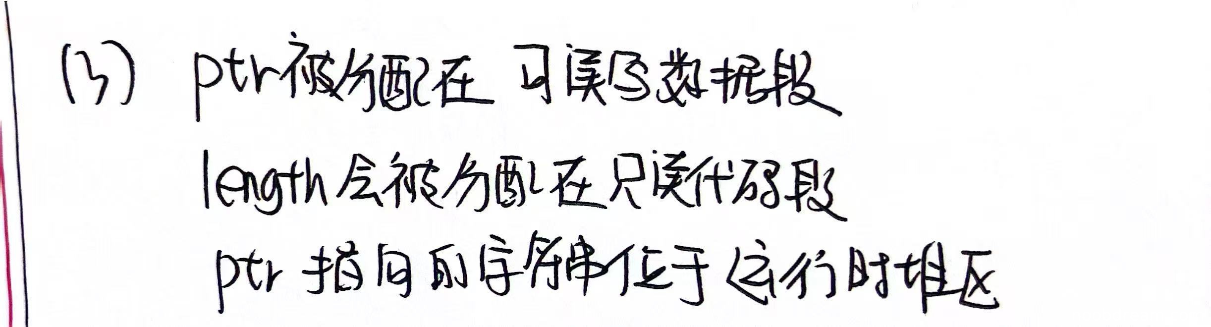 学生答案正确指出ptr被分配在可读写数据段(或可读数据段),ptr指向的字符串位于运行时堆区。但错误指出length会被分配在只读代码段(应位于用户栈)。因此ptr分配位置和字符串位置正确各得1分,length分配位置错误扣1分。本小题最终得2分。