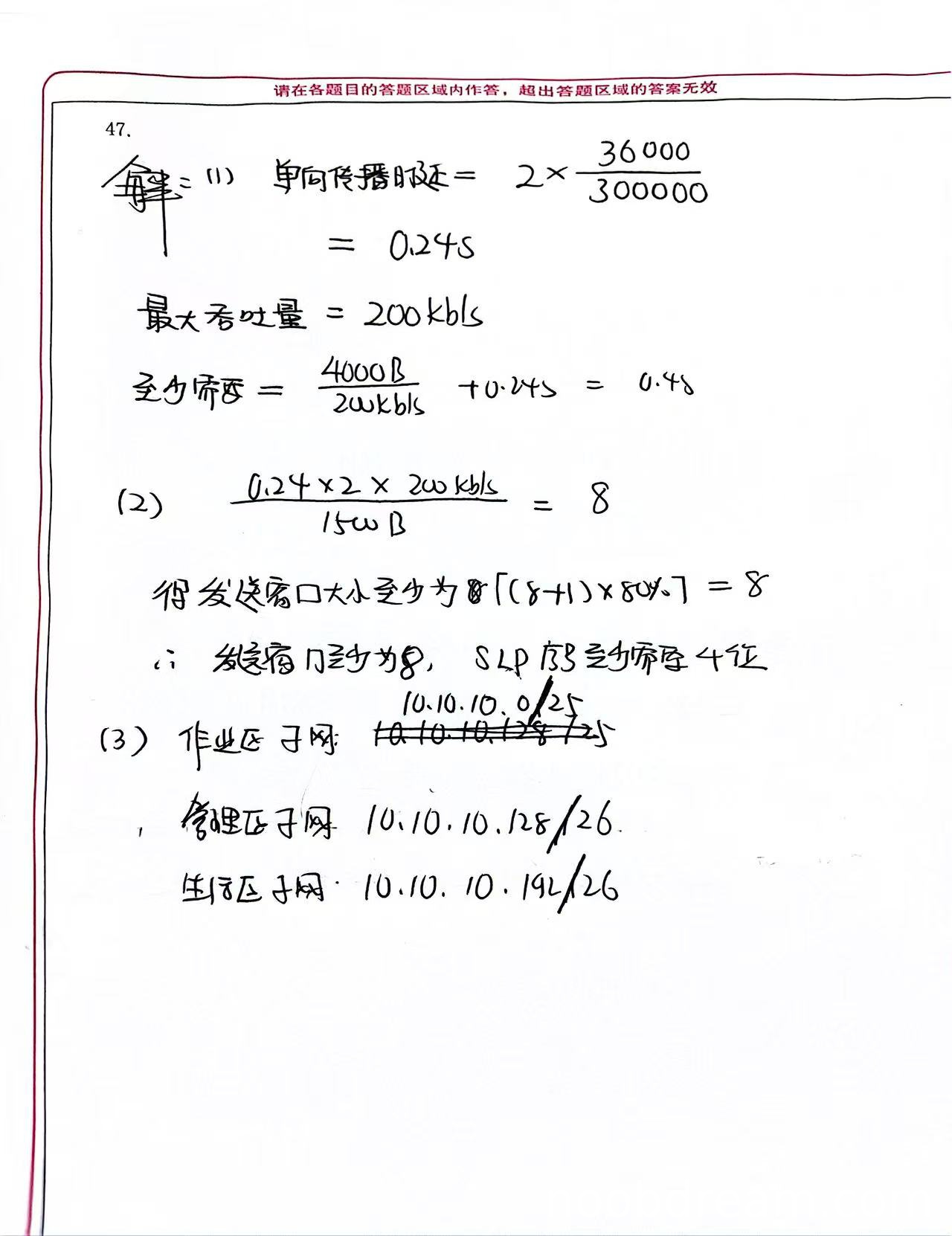 学生答案中单向传播时延计算正确(0.24s=240ms),最大吞吐量表述正确(200kbps),但文件传输时间计算有误。标准答案中总时间=传播时延+传输时延=240ms+(4000×8)/(200×10³)=240ms+160ms=400ms。学生第一次识别结果计算为0.44s(440ms),第二次识别结果计算为0.4s(400ms)。根据禁止扣分规则第3条,两次识别中只要有一次正确就不扣分,因此该项不扣分。得3分。