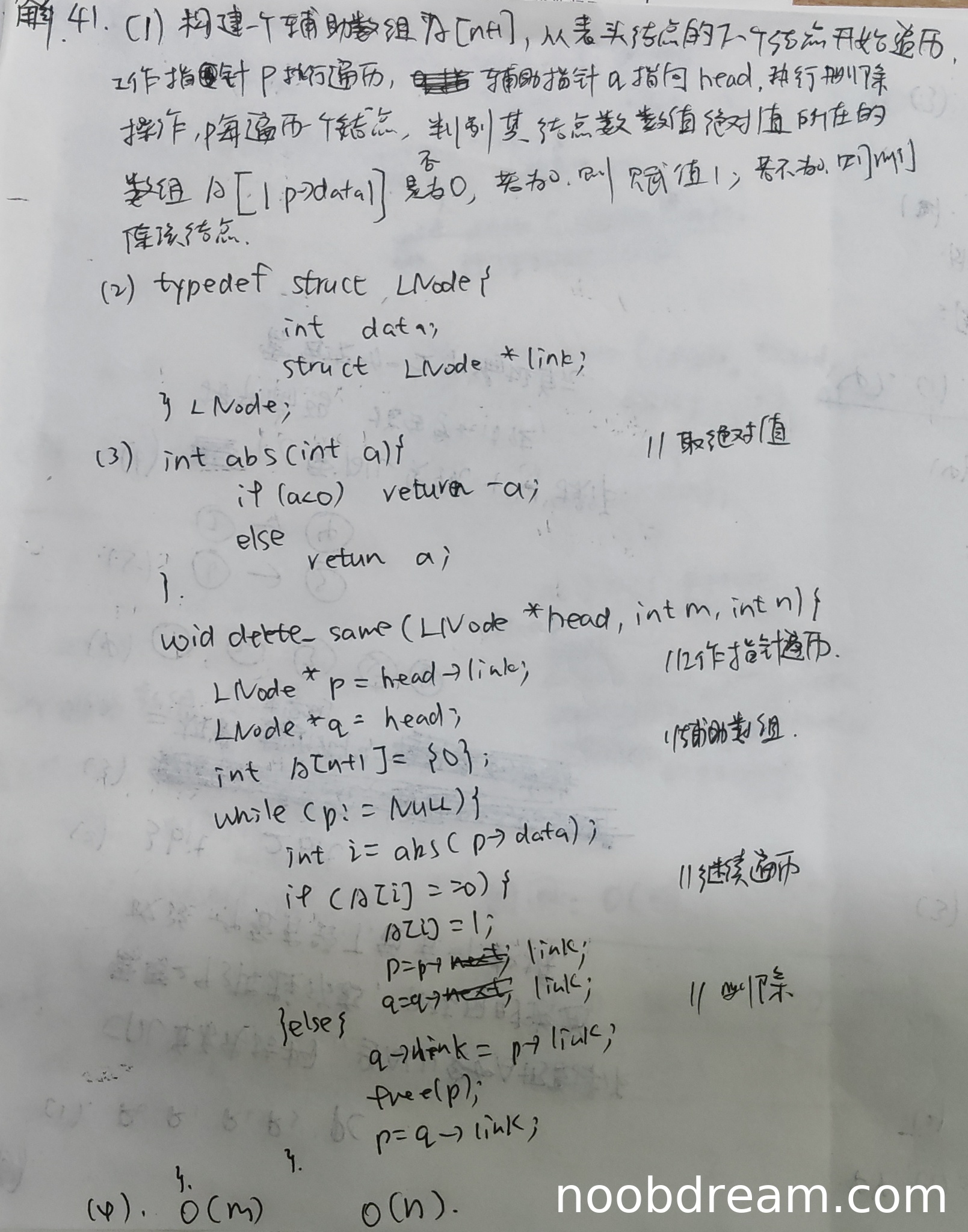理由:时间复杂度分析正确为O(m),但空间复杂度在第一次识别中正确为O(n),第二次识别中写成了"O(n) O(n)",表达不清晰且重复(扣1分)。