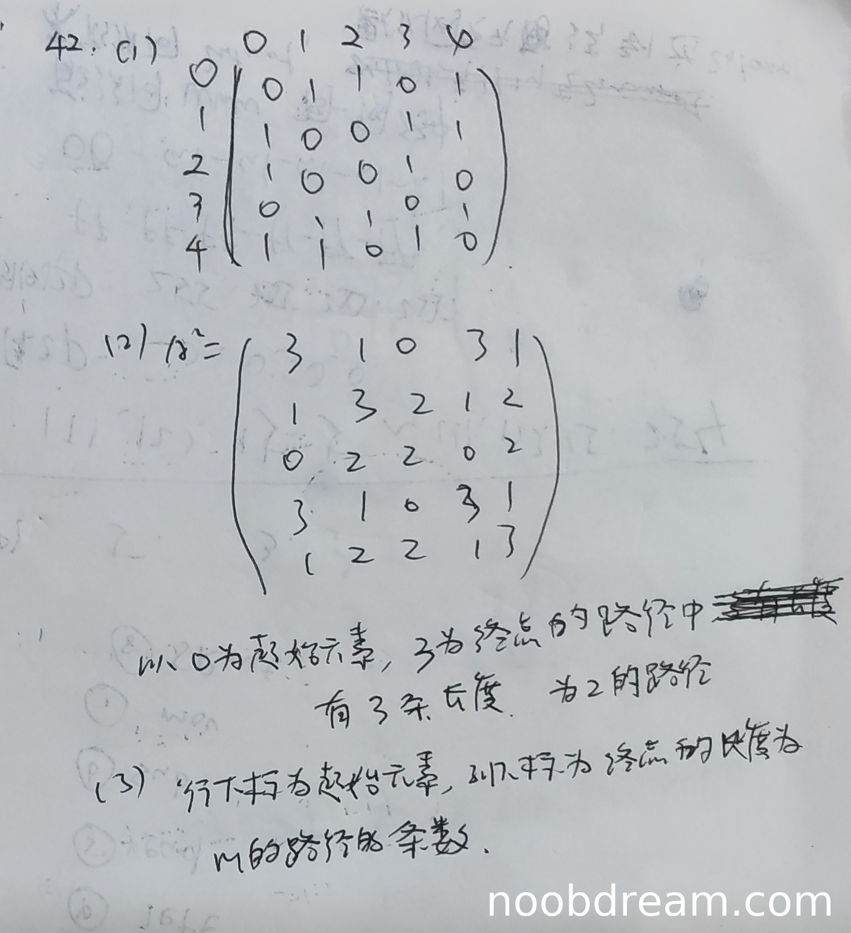 学生正确计算出了A²矩阵,且对0行3列元素值3的含义解释正确,即"以0为起始元素,3为终点的路径中,有3条长度为2的路径"。虽然表述与标准答案略有差异,但核心意思完全正确。因此得满分4分。