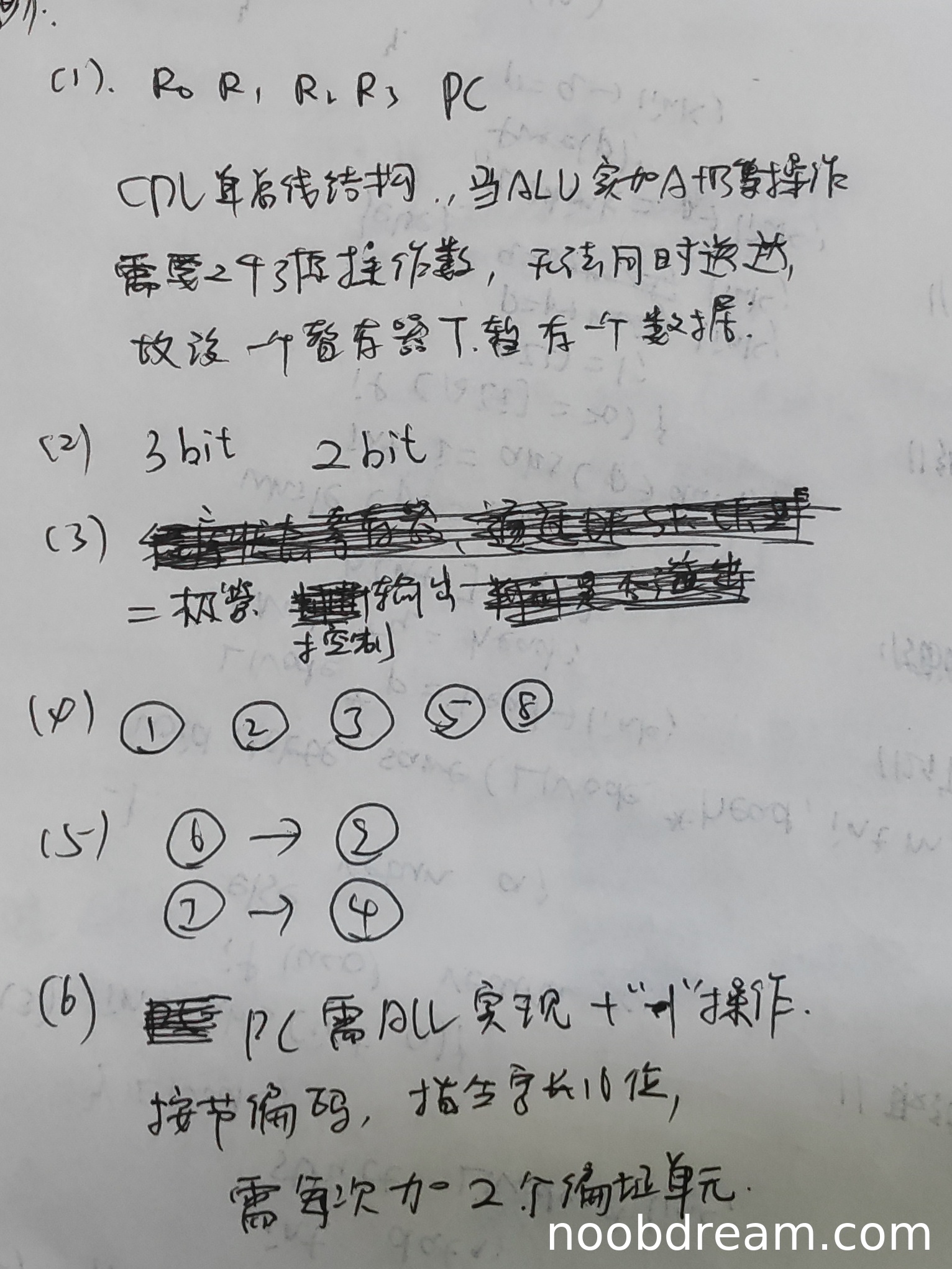学生答出了程序员可见寄存器为R0~R3和PC,得2分;说明了暂存器T的作用是暂存一个操作数,因为单总线结构无法同时提供两个操作数给ALU,得1分。因此本小题得3分。