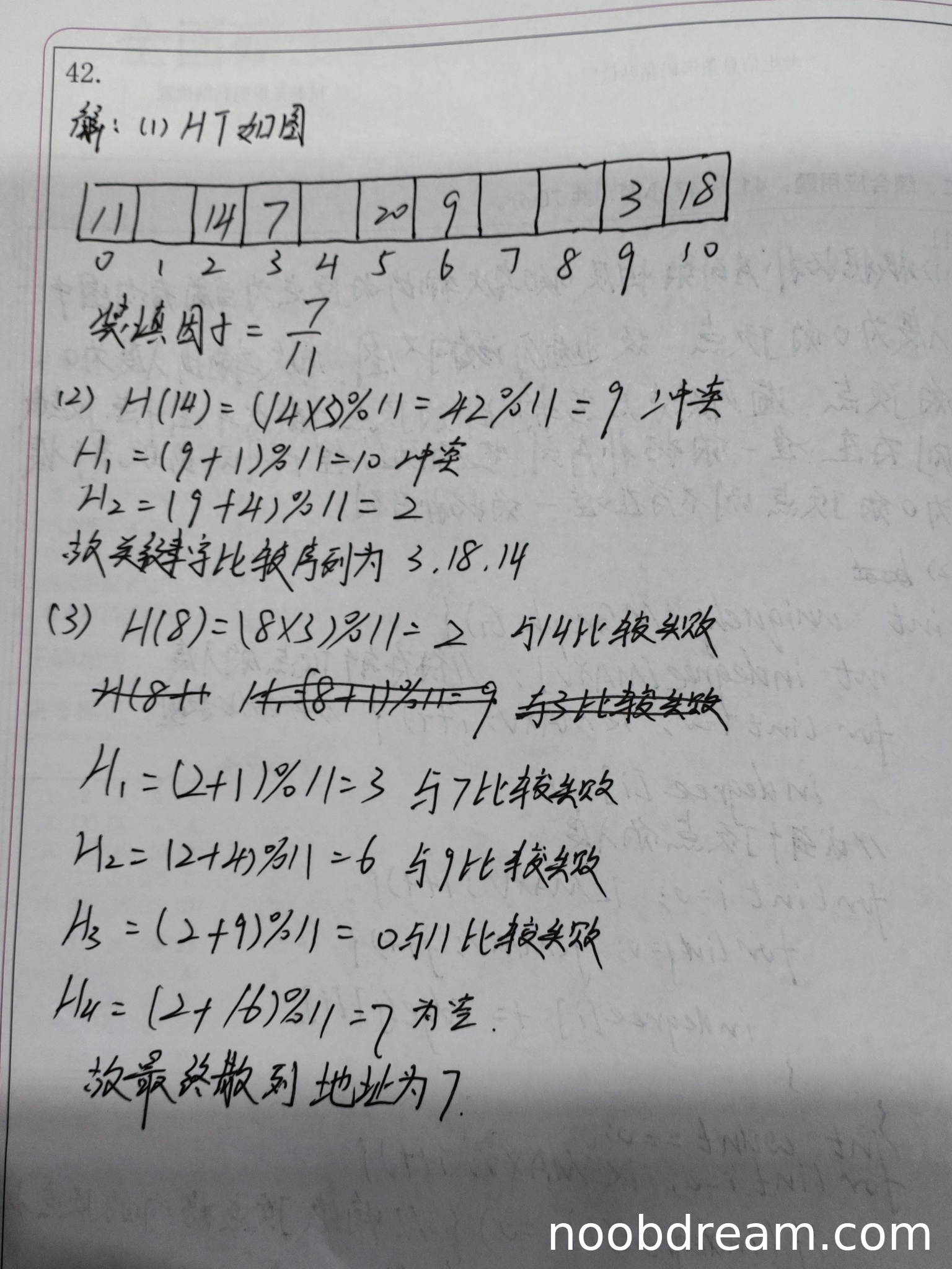 学生正确计算了所有关键字的散列地址,并正确构造了散列表(虽然图示未完整显示,但文字描述和装填因子计算正确)。散列地址计算过程与标准答案一致,装填因子7/11正确。因此得6分。