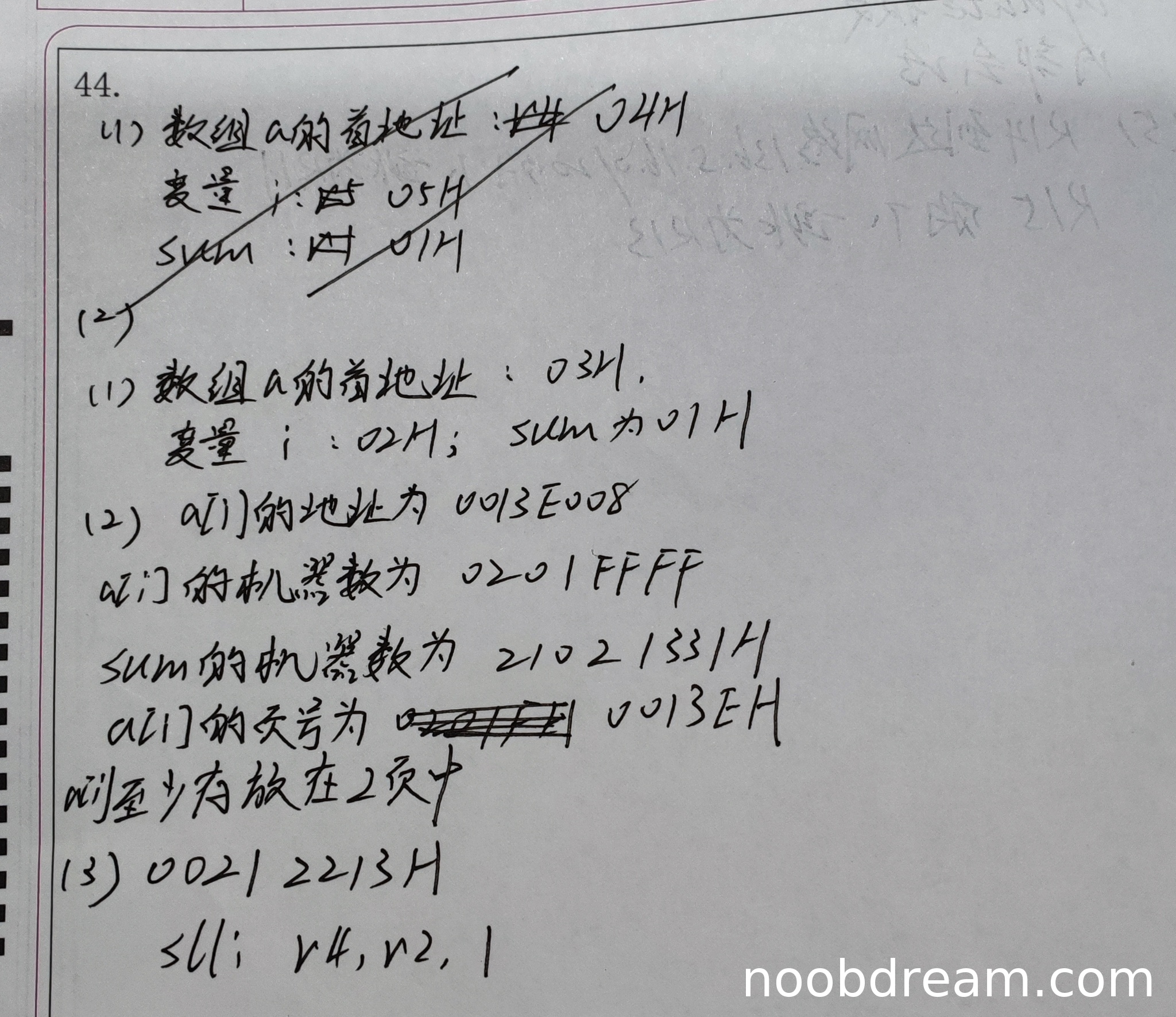 学生两次识别结果均给出了a[i]的地址为0013E008H,但标准答案中a[i]的地址应为0013E004H(因为i=5时,地址计算为0013DFF0H + 5*4 = 0013E004H),因此地址计算错误。a[i]的机器数学生回答为0201FFFFH,但标准答案为FFFFECDCH,错误。sum的机器数学生回答为21021331H,但标准答案为0000000EH,错误。a[i]所在页号学生回答为0013EH,正确(页号计算为地址高20位,0013E004H的高20位是0013EH)。数组a至少存放在2页中,学生回答正确。因此,本小题中页号和跨页判断正确,但地址、a[i]机器数、sum机器数均错误,扣3分,得2分。